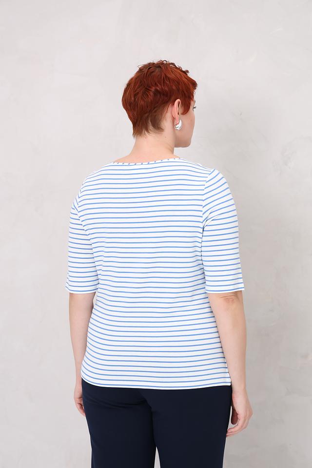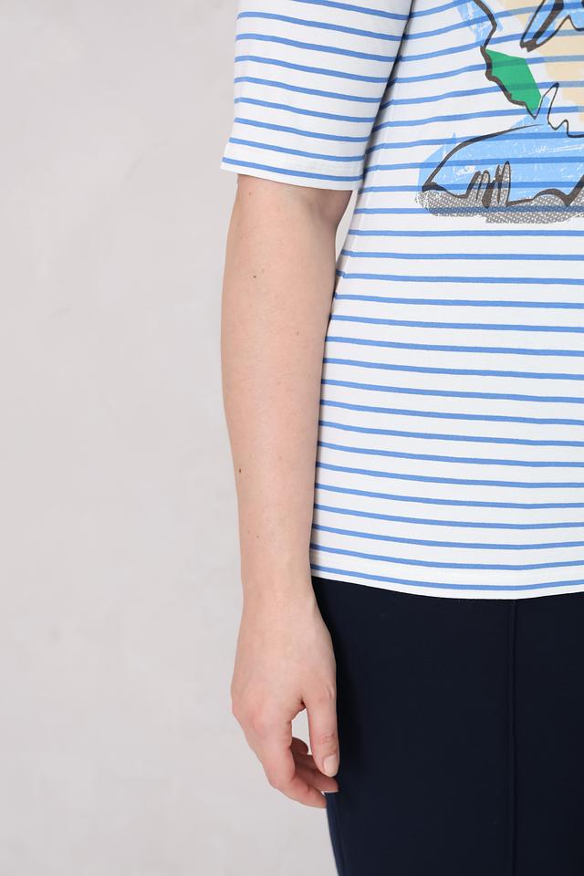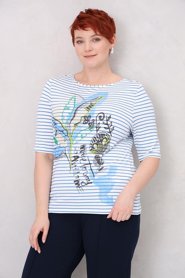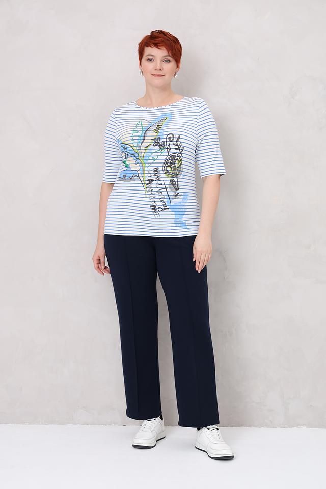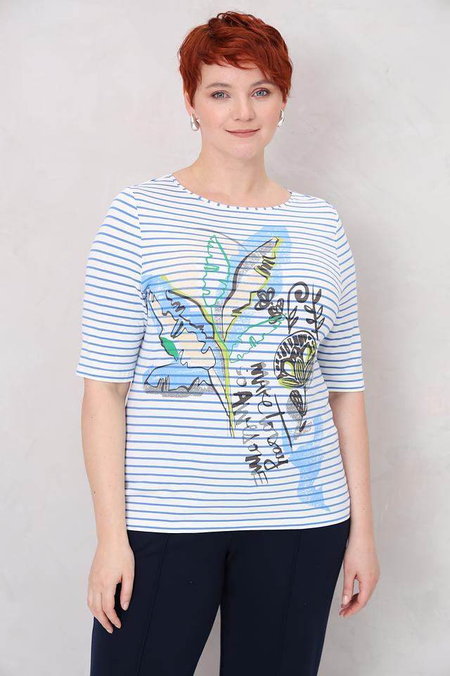 Футболка имеет классический крой с короткими рукавами и округлым вырезом горловины. Главная особенность модели – яркий и оригинальный принт с изображением цветов и растительных элементов, выполненный в голубых, зеленых и желтых тонах. Голубо-белая полоска добавляет свежести и легкости.