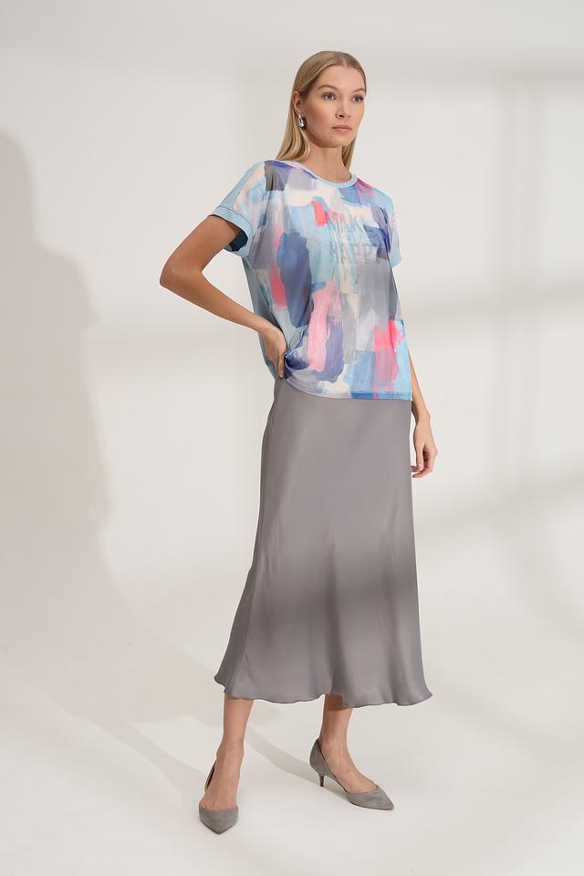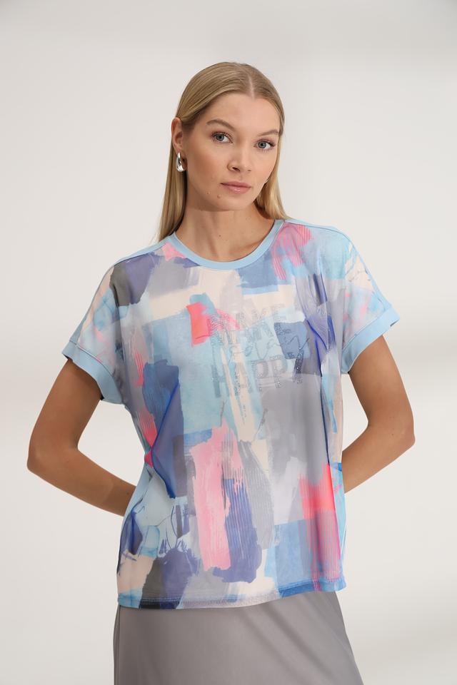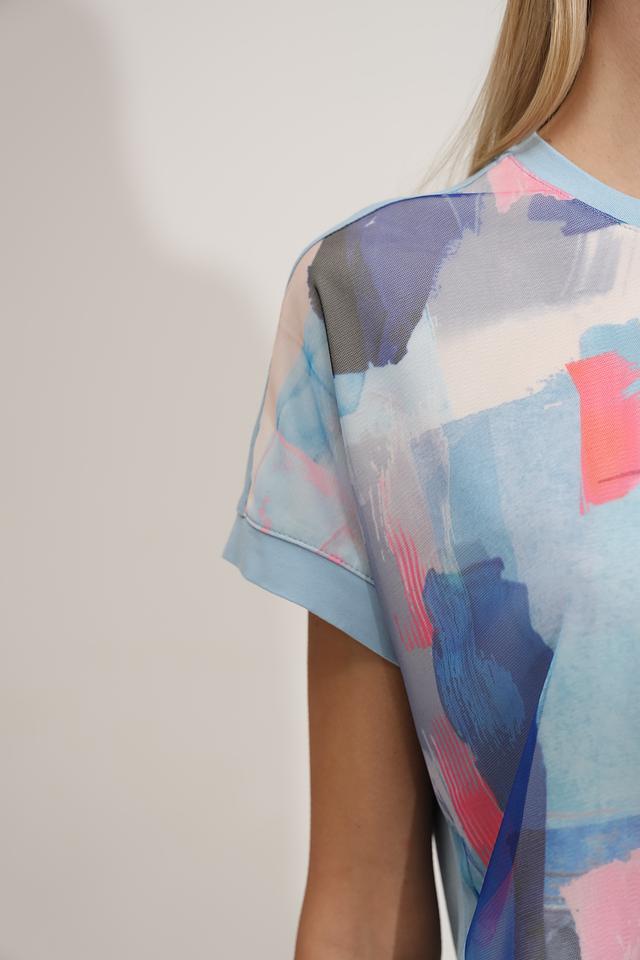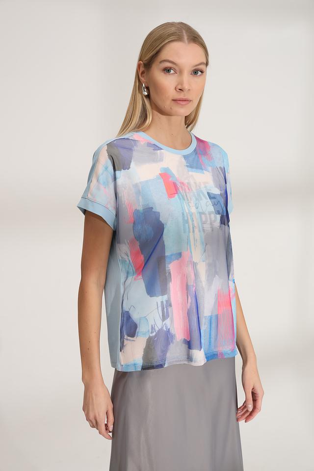 Особенностью данной модели является яркий абстрактный принт, выполненный в различных оттенках голубого, розового и серого. Футболка имеет прямой крой, короткие рукава и круглый вырез горловины.