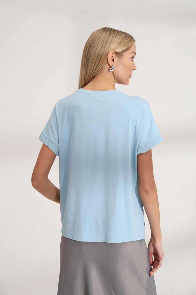 Женская футболка Lecomte светло-голубого цвета с абстрактным принтом и короткими рукавами. Изготовлена из мягкой вискозы с добавлением эластана для комфорта и свободы движений. Стильный и удобный вариант для повседневного образа. Состав: вискоза 96%, эластан 4%