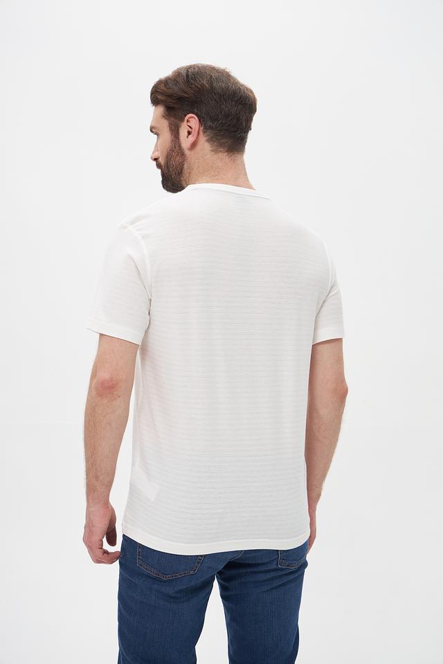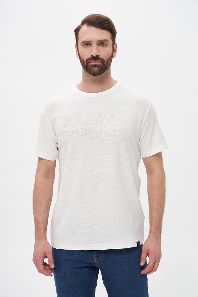 Особенностью данной модели является фактурная текстура ткани и оригинальный принт на груди. Принт выполнен в технике, имитирующей надпись, что придает футболке современный и лаконичный вид.