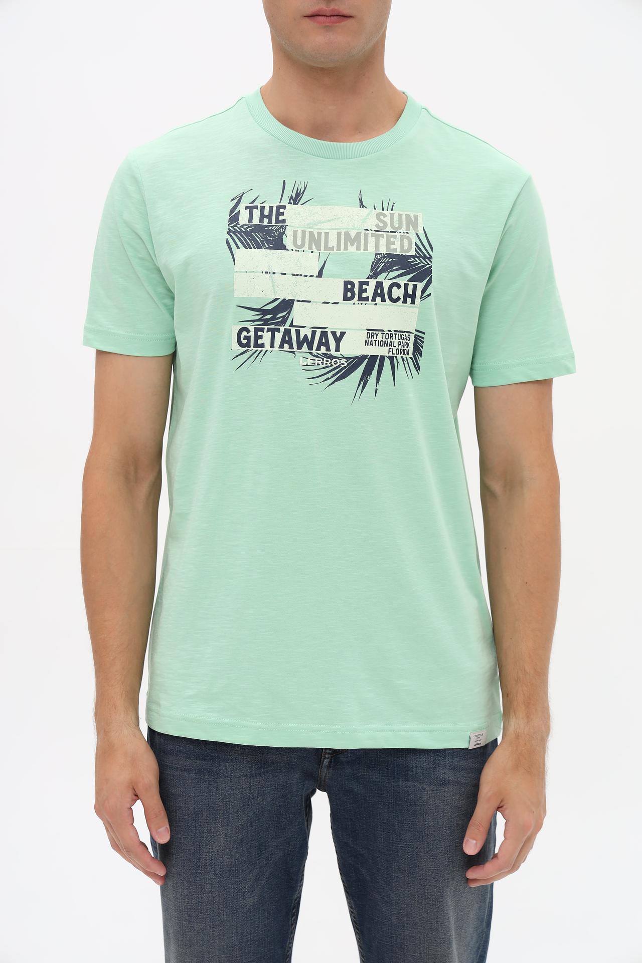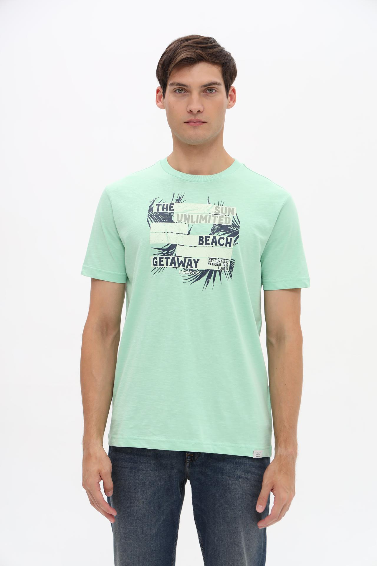 Модель выполнена в модном мятном цвете и украшена оригинальным принтом с изображением пальмовых листьев и надписей. Футболка имеет классический крой, прямой силуэт и короткие рукава. Она идеально подходит для создания как повседневных, так и более нарядных образов.