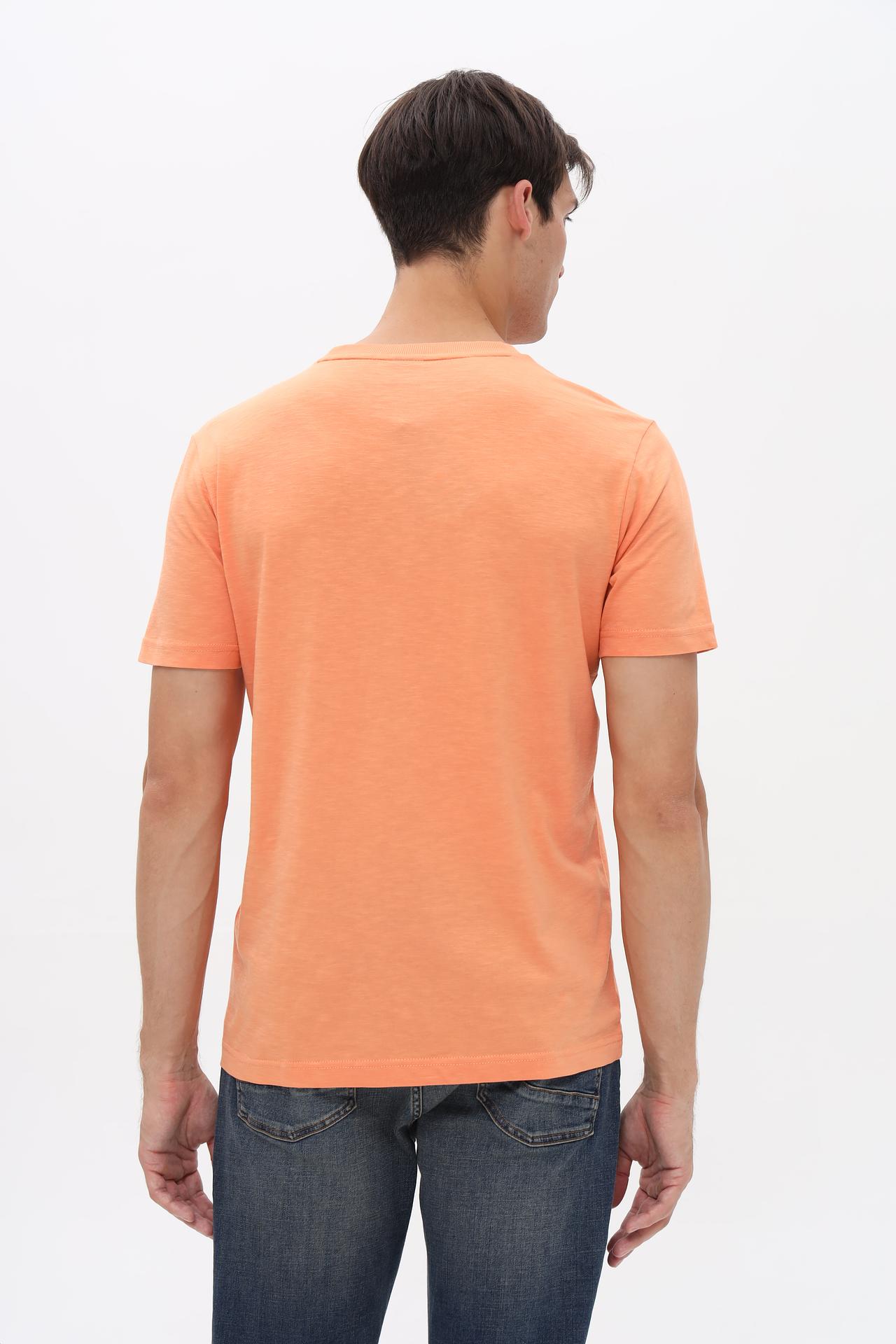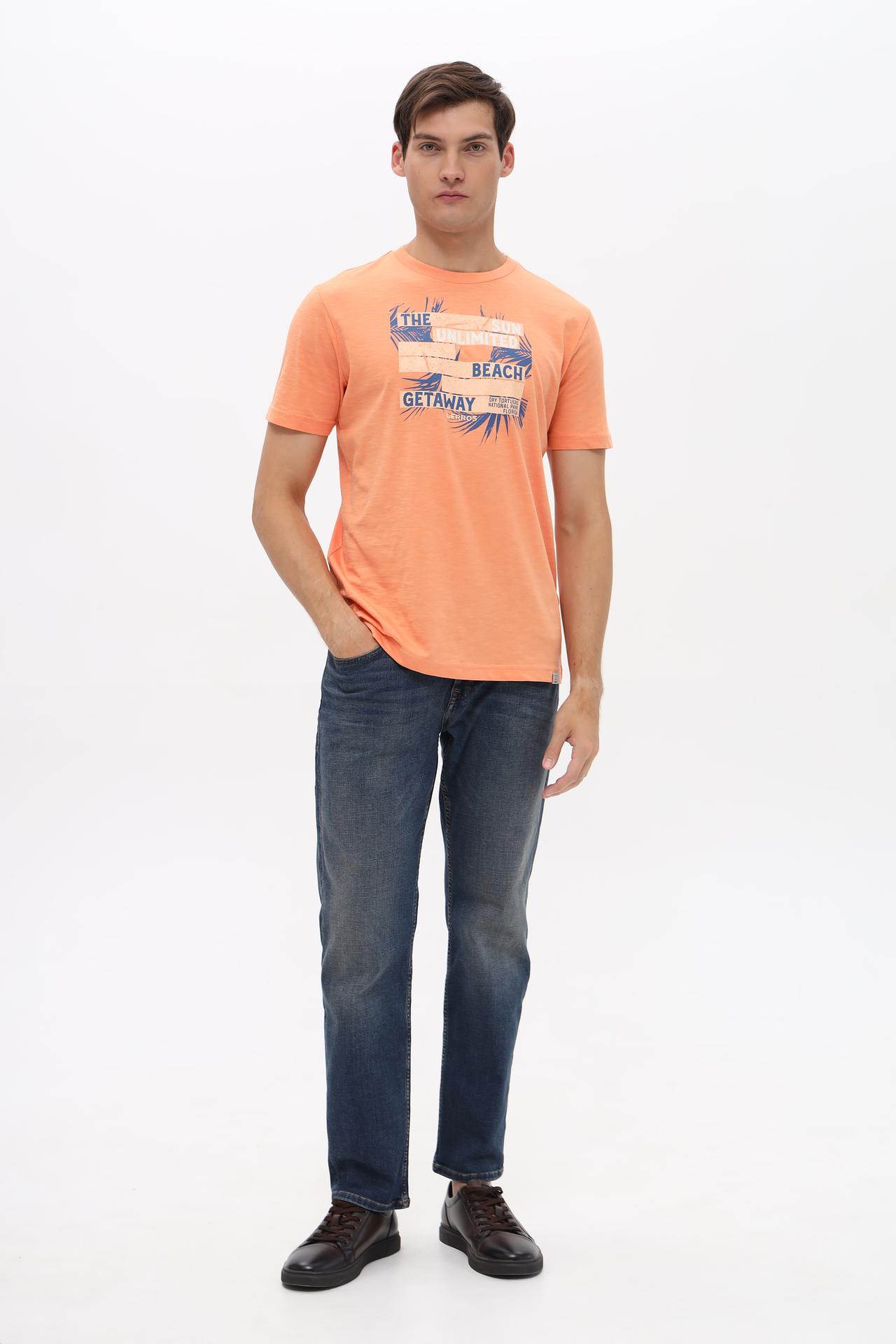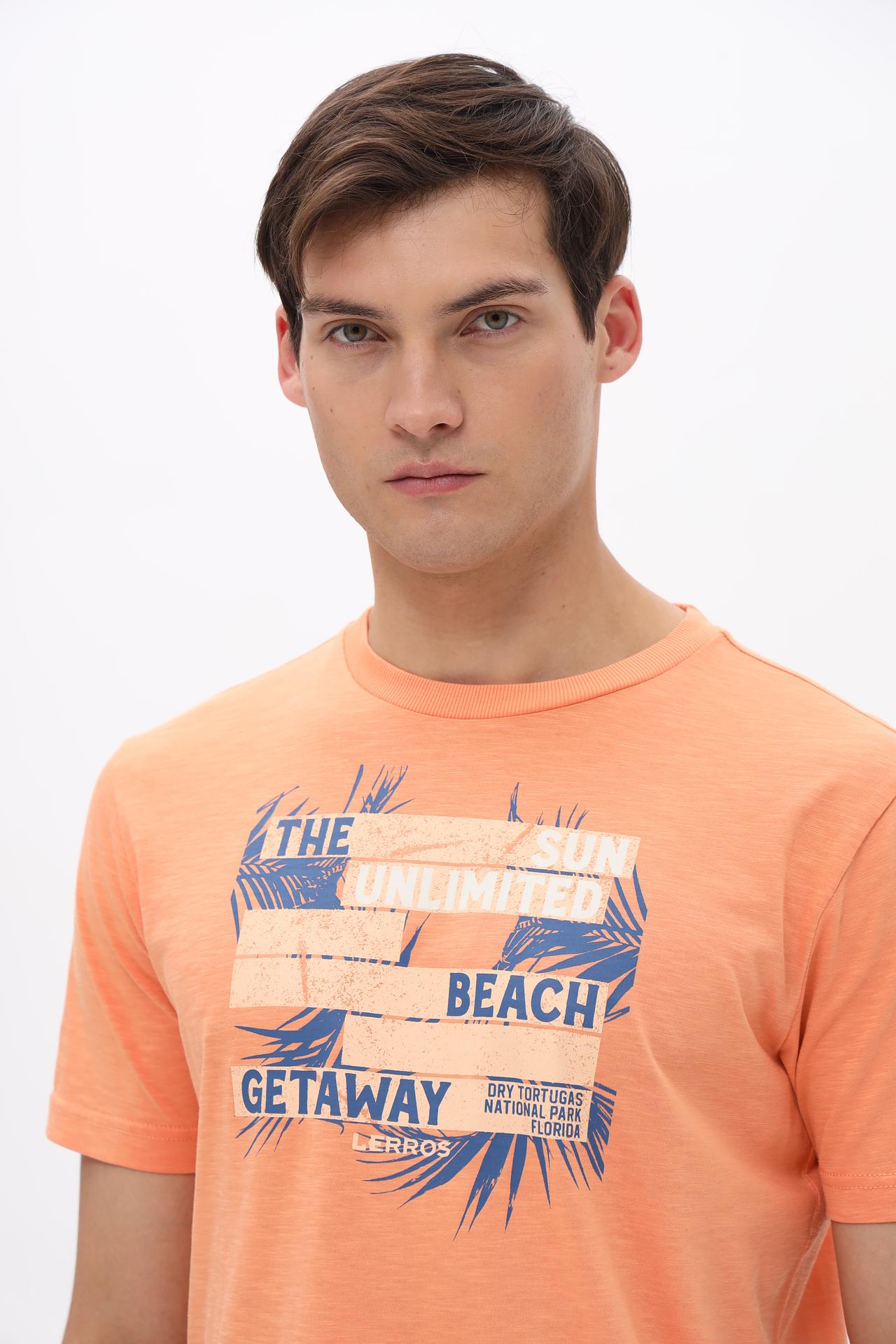Модель выполнена в модном персиковом цвете и украшена оригинальным принтом с изображением пальмовых листьев и надписей, придающим футболке неповторимый летний стиль. Прямой крой обеспечивает свободу движений.