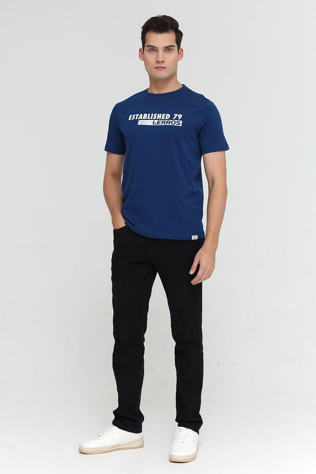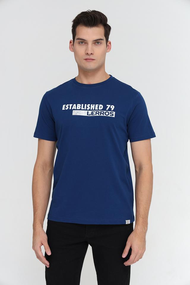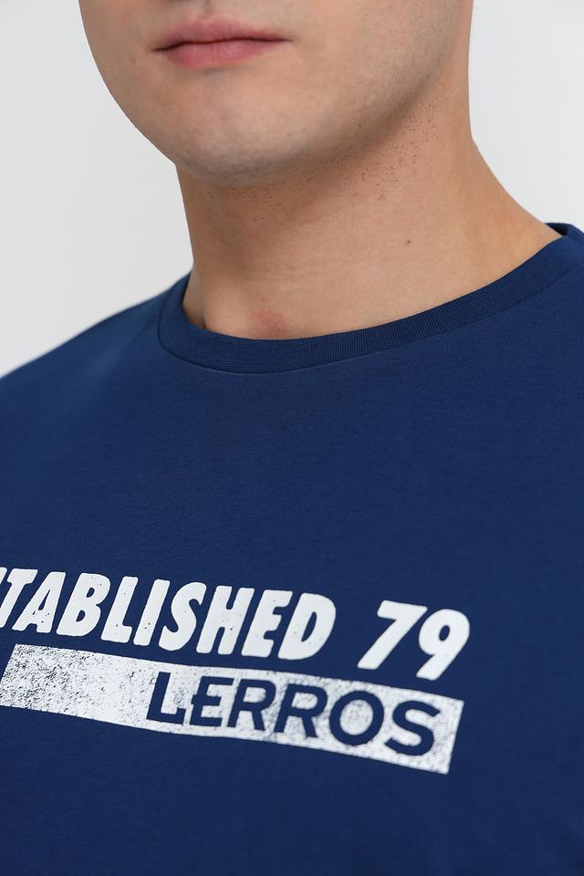 На передней части футболки расположен белый принт с надписью "ESTABLISHED 79" и логотипом бренда Lerros. Круглый вырез горловины и короткие рукава обеспечивают свободу движений. На левой стороне груди, сбоку, присутствует небольшой логотип бренда.
