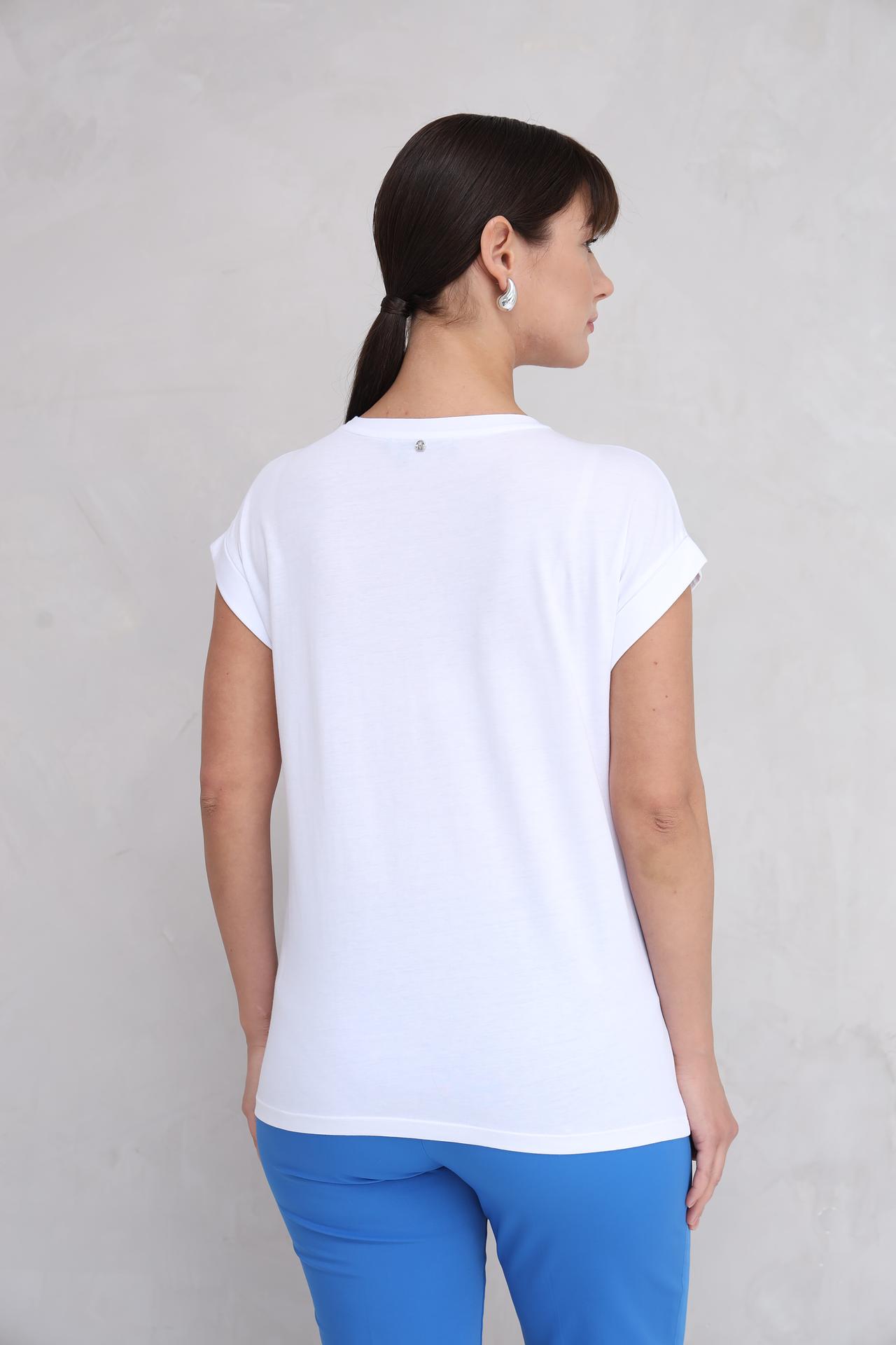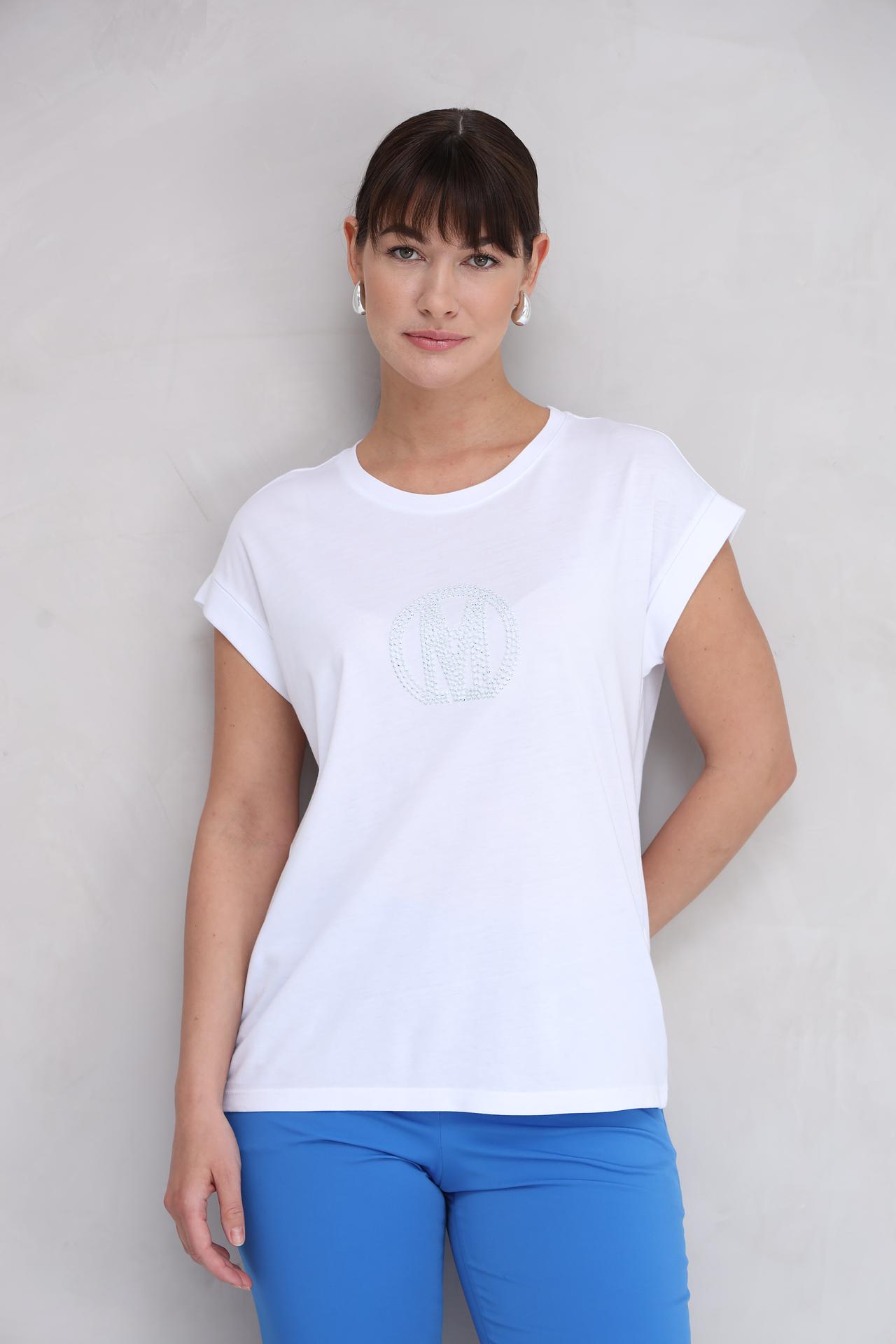 Особое внимание привлекает декоративный элемент на груди – стилизованная буква "М", выполненная из мерцающих страз нежного оттенка, придающая изделию утонченный вид и индивидуальность. Эта женская футболка Marc Aurel станет незаменимой вещью для повседневного использования.