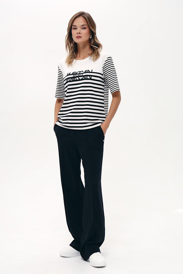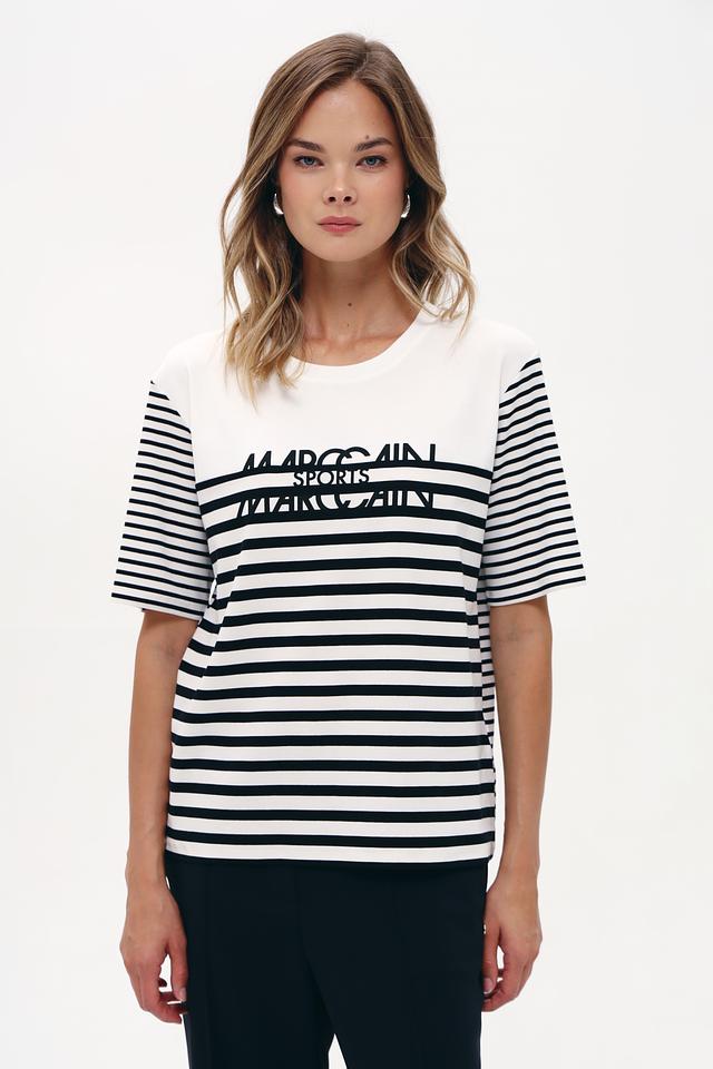 Женская футболка Marc Cain Sports чёрно-белого цвета с логотипом и полосками. Изготовлена из хлопка с добавлением эластана для комфорта и лучшей посадки. Состав: хлопок 95%, эластан 5%