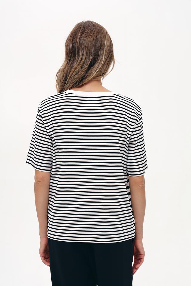 Эта стильная футболка от Marc Cain Sports станет отличным дополнением к вашему гардеробу. Классический крой и сочетание чёрно-белых полосок делают её универсальной и подходящей для различных образов.
