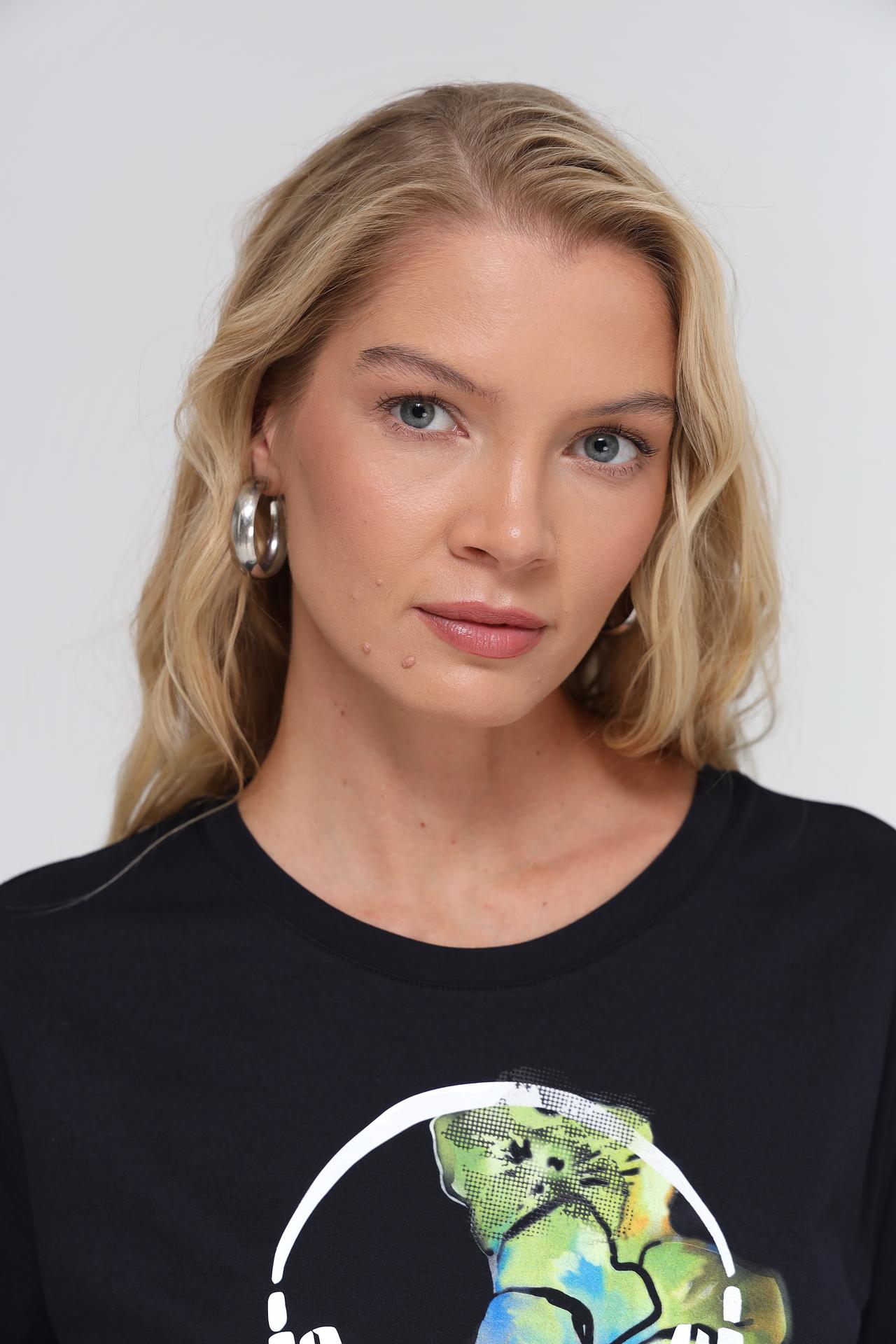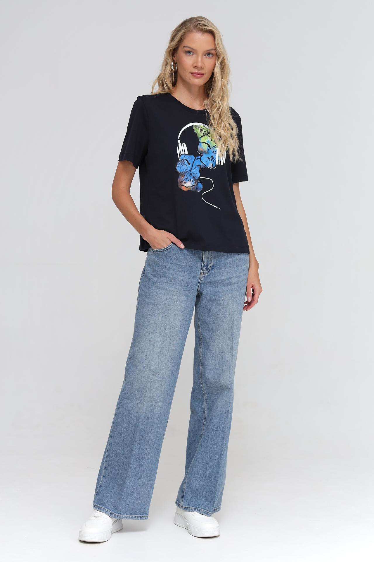 - Дизайн: Классический черный цвет футболки дополнен оригинальным принтом с изображением наушников и ярких цветов. Этот акцент придает изделию индивидуальность и свежесть.