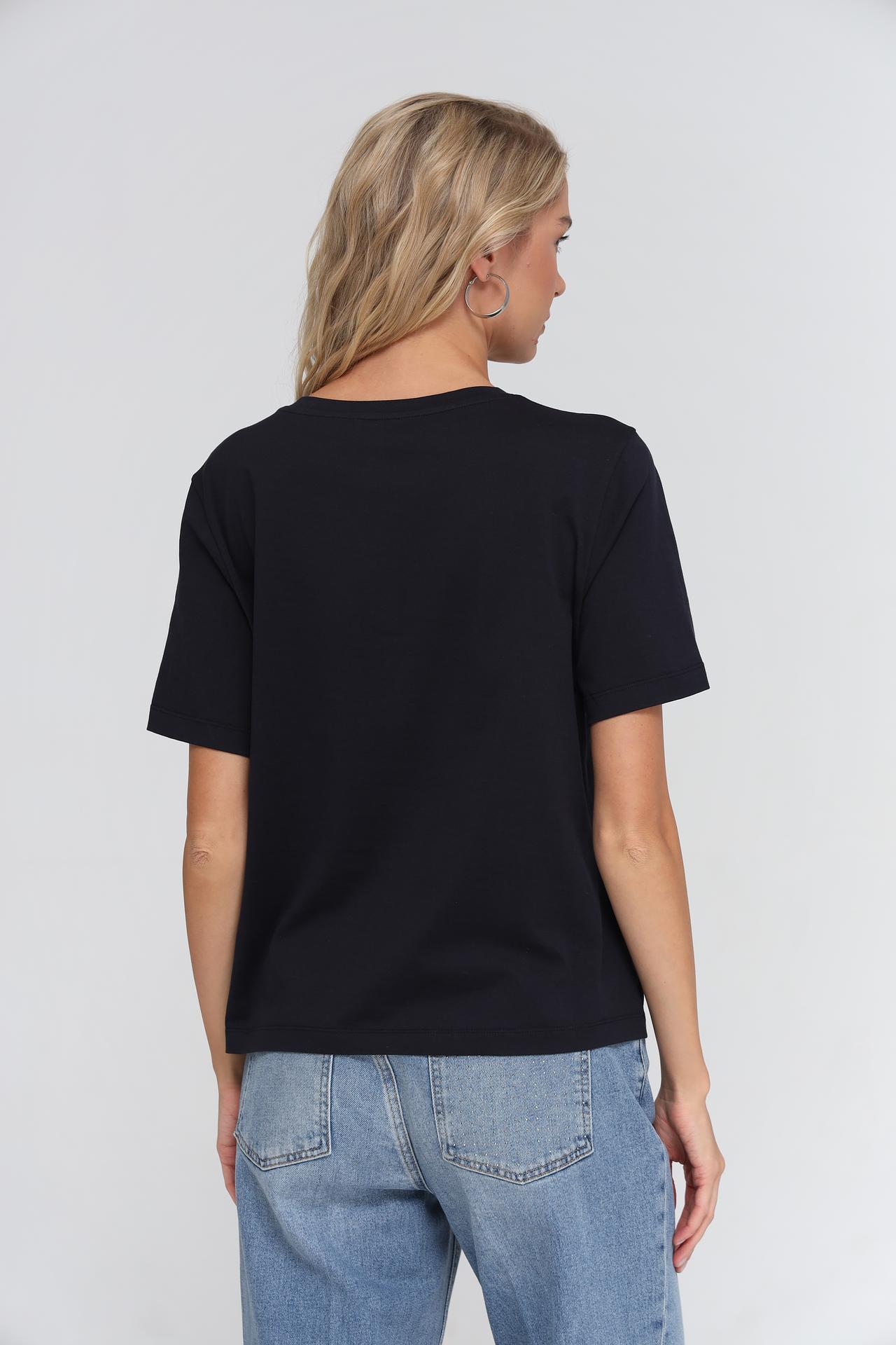 - Крой: Прямой силуэт и короткие рукава создают расслабленный, но элегантный вид. Футболка хорошо садится по фигуре, не сковывая движений.