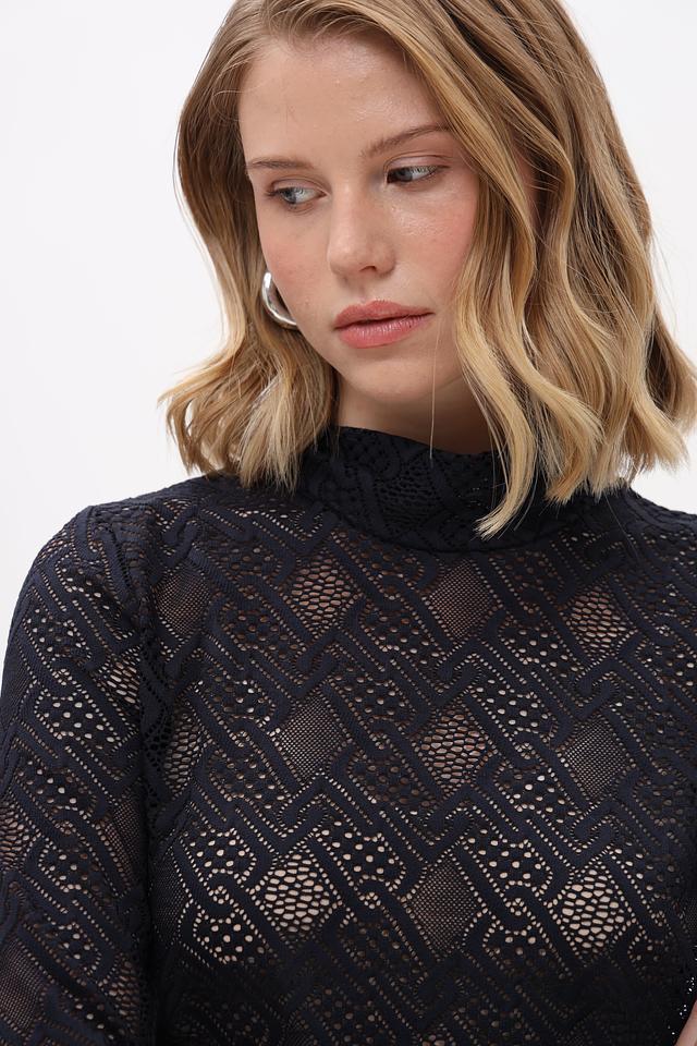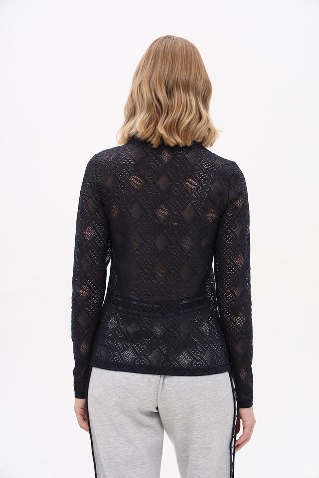 Чёрная футболка с длинным рукавом от Marc Cain, выполненная из полупрозрачной ткани с геометрическим узором. Состав: 93% полиамид, 7% эластан. Состав: полиамид 93%, эластан 7%