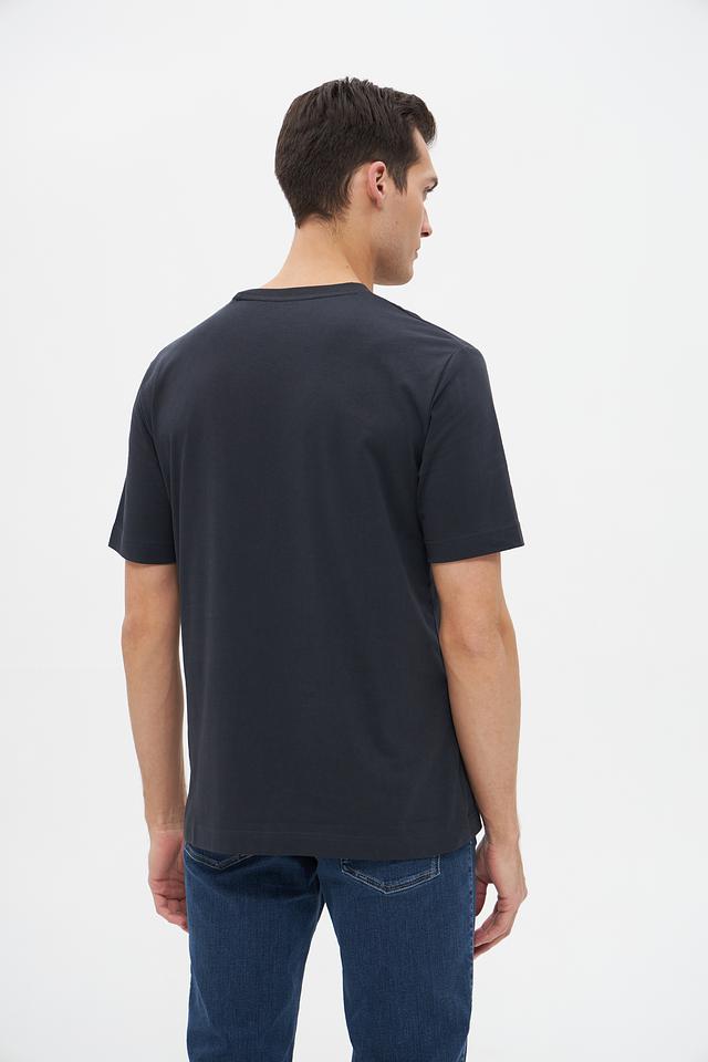 Классический крой и V-образный вырез делают эту футболку универсальным элементом гардероба, подходящим для различных стилей и ситуаций. Тёмно-синий цвет придает образу элегантность и сдержанность.