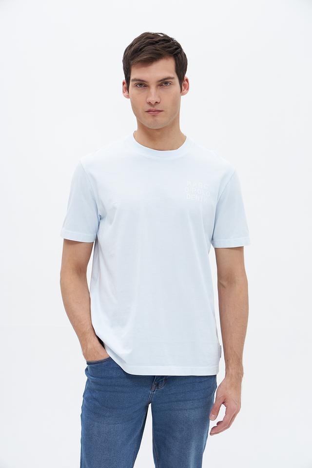 Дизайн футболки отличается лаконичностью и минимализмом. На груди и спине нанесена надпись "MARC O'POLO DENIM", выполненная в тон ткани, что придает ей особый шарм. Круглый вырез горловины и короткие рукава делают эту футболку идеальным выбором для теплой погоды.