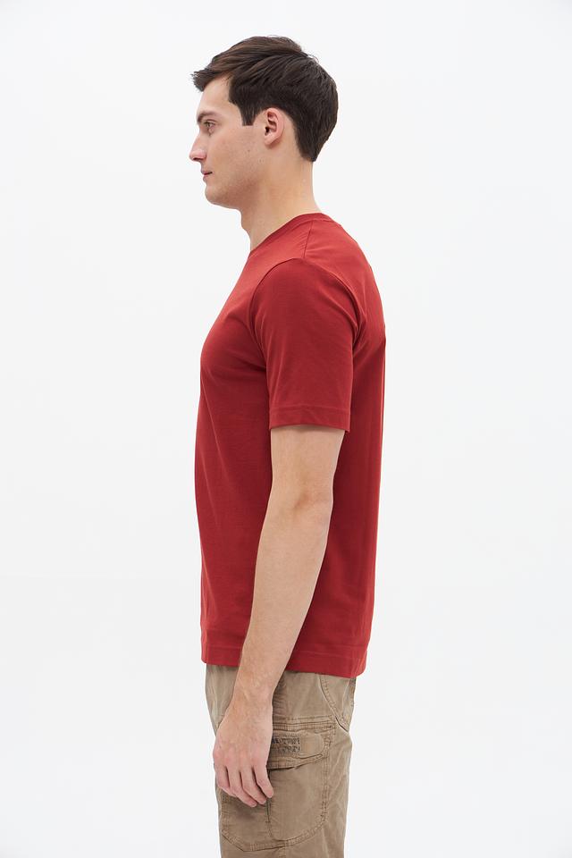 Футболка имеет насыщенный бордовый цвет, который легко сочетается с различными элементами гардероба. На груди располагается небольшой логотип бренда, выполненный в тон.