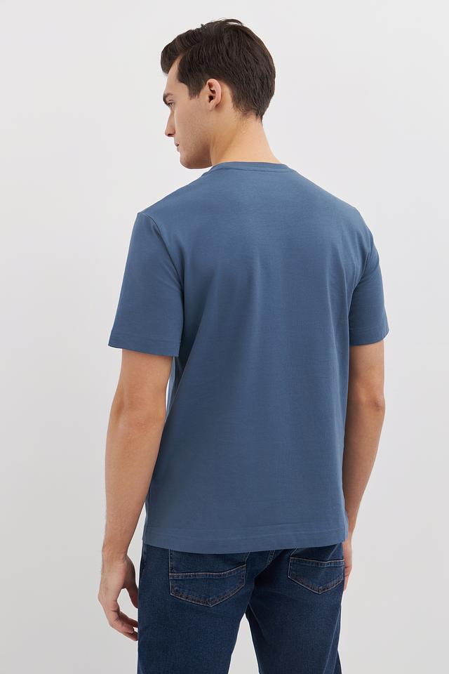 Футболка имеет классический прямой крой, который подходит для любого типа фигуры. Голубой цвет и оригинальный принт на груди придают ей современный и стильный вид. Принт выполнен в виде прямоугольника с изображением горного пейзажа.