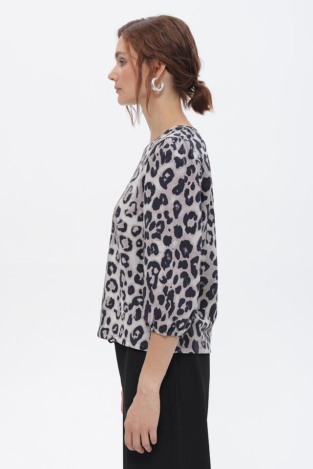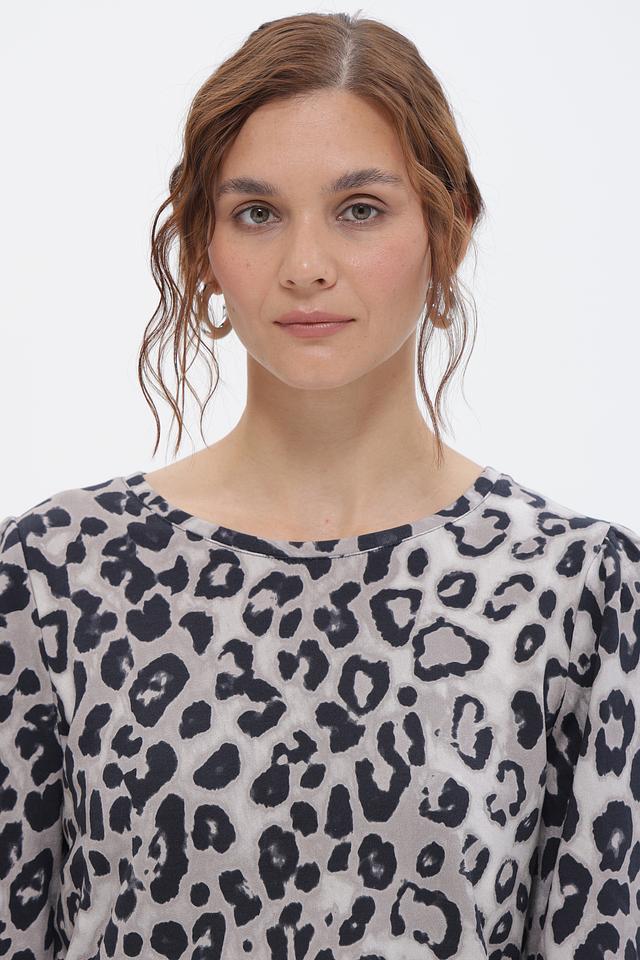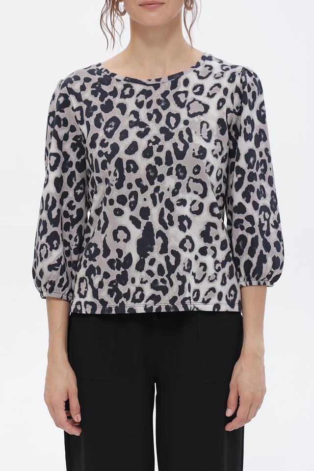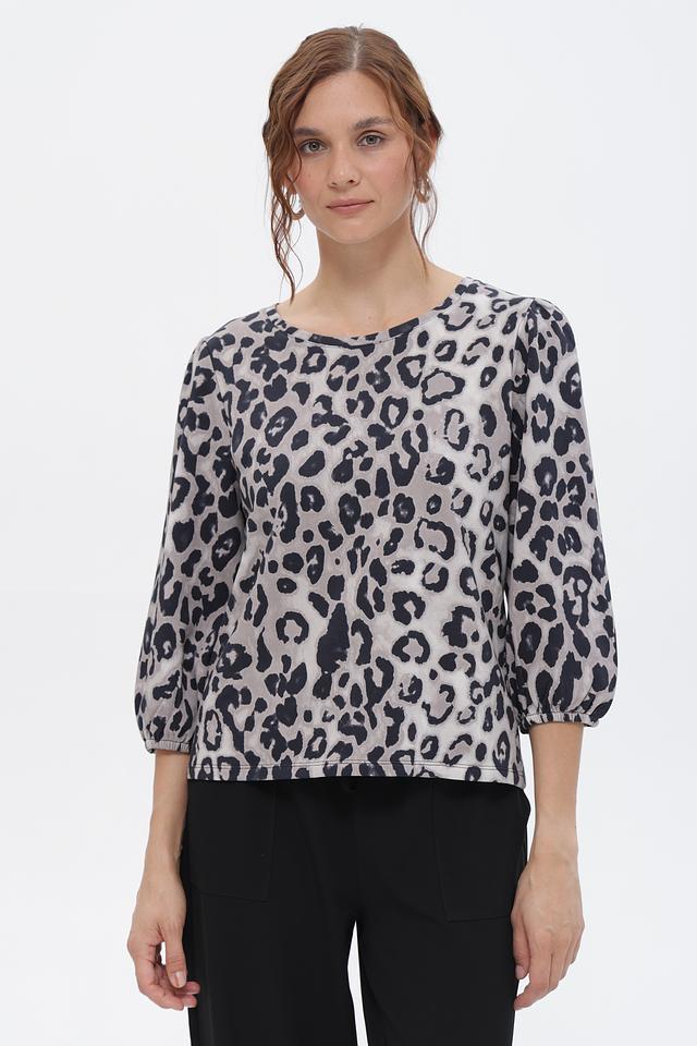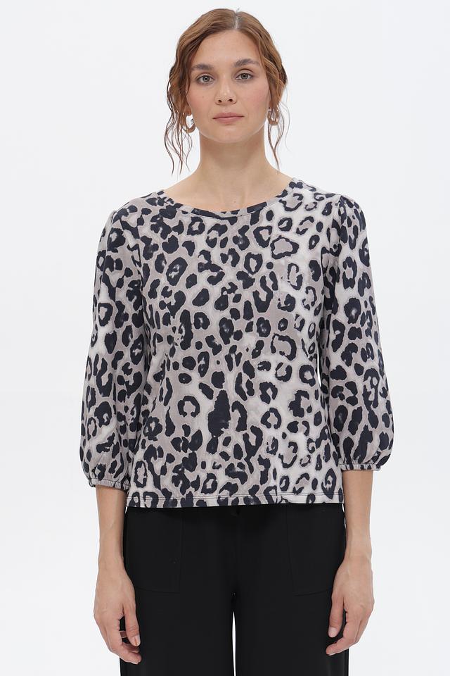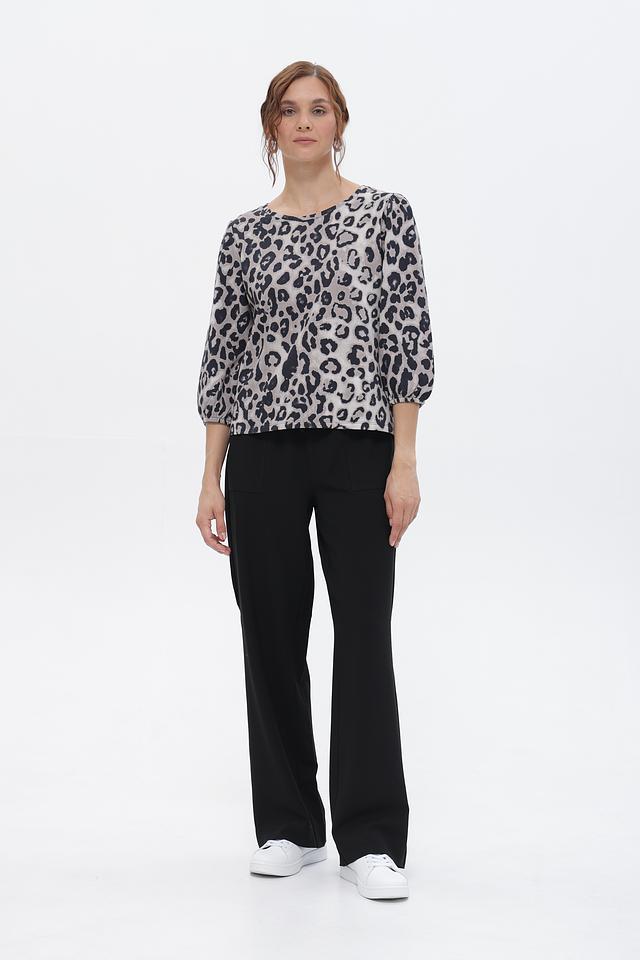 Женская футболка Monari серого цвета с оригинальным леопардовым принтом. Модель выполнена из мягкого хлопка и имеет рукава 3/4 с небольшим буфом, что придает ей особый шарм. Состав: хлопок 100%