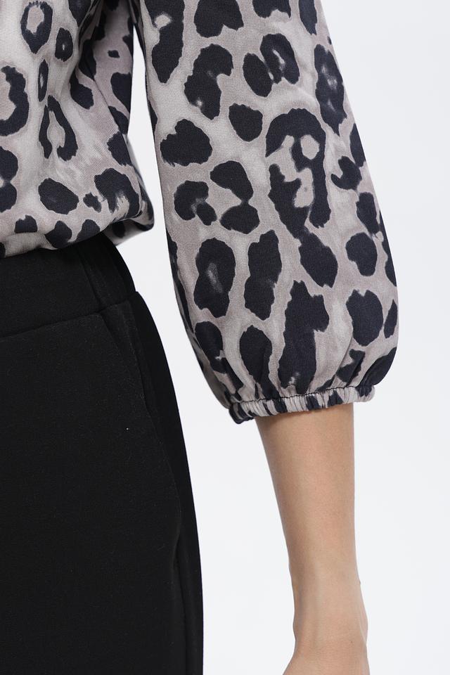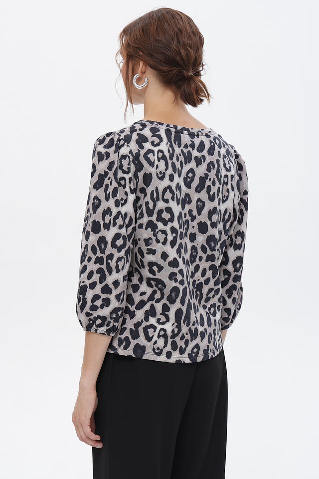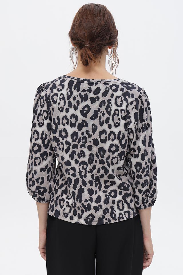 Футболка имеет свободный крой, который не сковывает движения, и короткие рукава с небольшим буфом, придающим образу женственность. Особенностью модели является яркий леопардовый принт, который добавит вашему образу динамичности и индивидуальности.