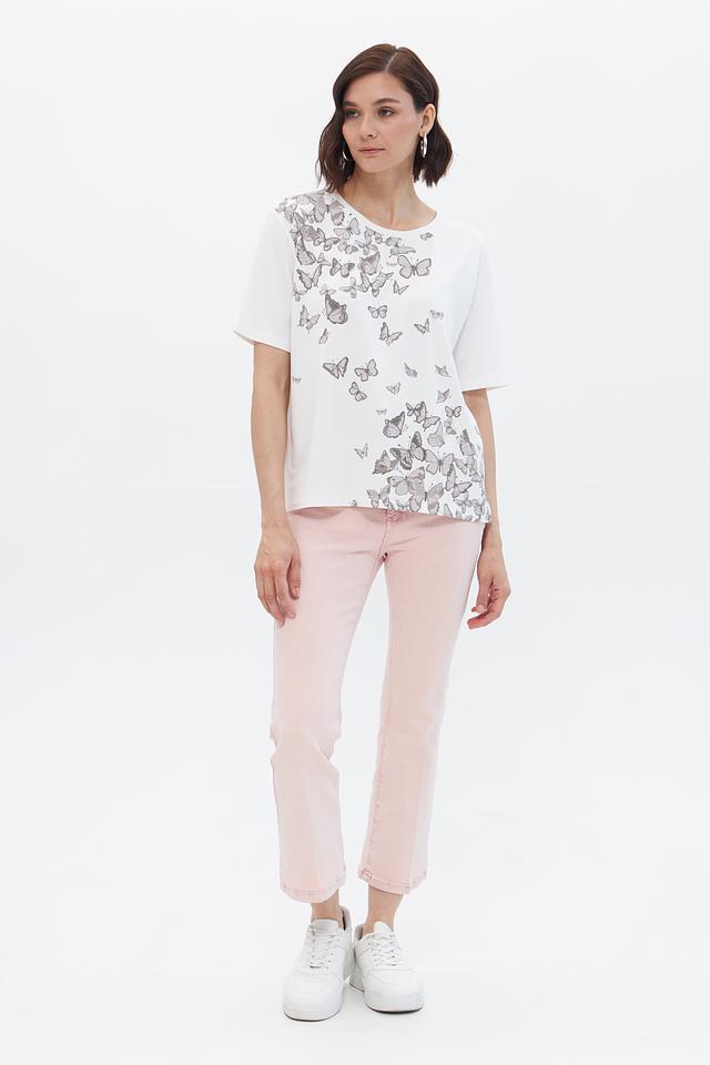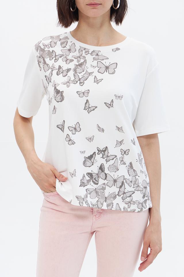 Эта стильная футболка от Monari выполнена в белом цвете и украшена изысканным принтом с изображением бабочек. Футболка имеет прямой крой и короткие рукава, что делает ее идеальным выбором для теплой погоды.