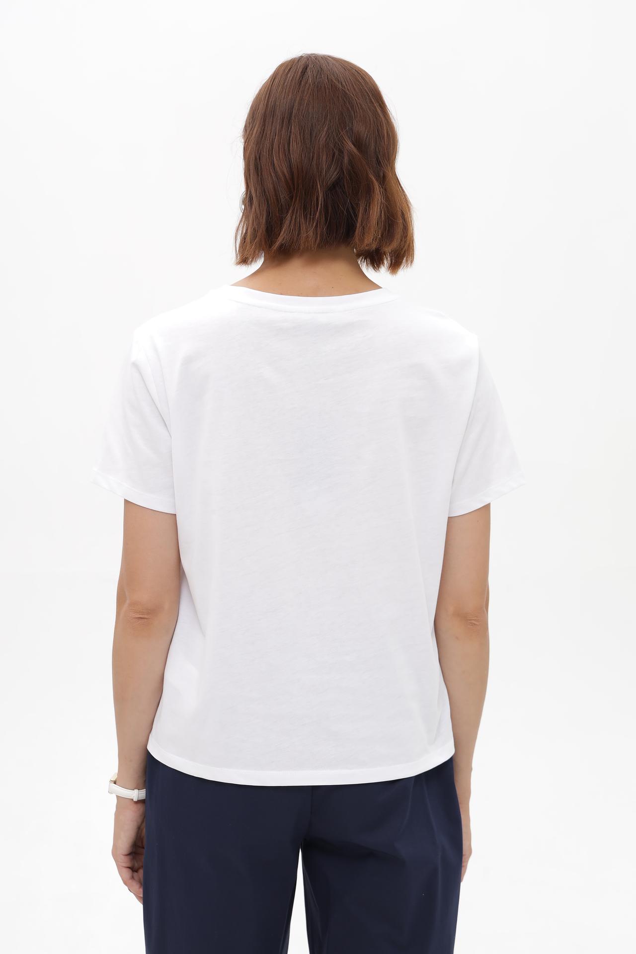 Эта футболка станет незаменимой основой для повседневных ансамблей или отпускных комплектов, легко сочетаясь с джинсами, шортами или брюками. Благодаря натуральному составу, она позволяет коже дышать, что особенно важно в теплую погоду.