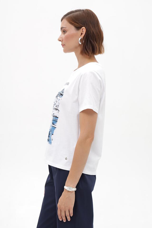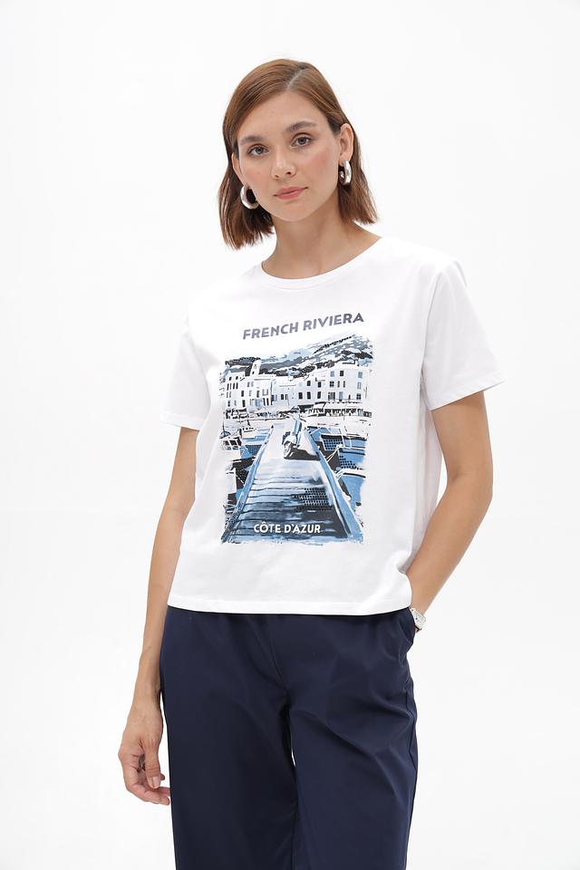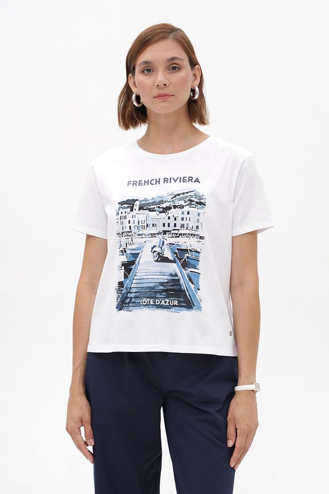 Белая футболка Monari с ярким принтом в стиле French Riviera. Изготовлена из 100% хлопка, обеспечивающего комфорт в носке. Идеальный выбор для создания непринужденного летнего образа. Состав: хлопок 100%