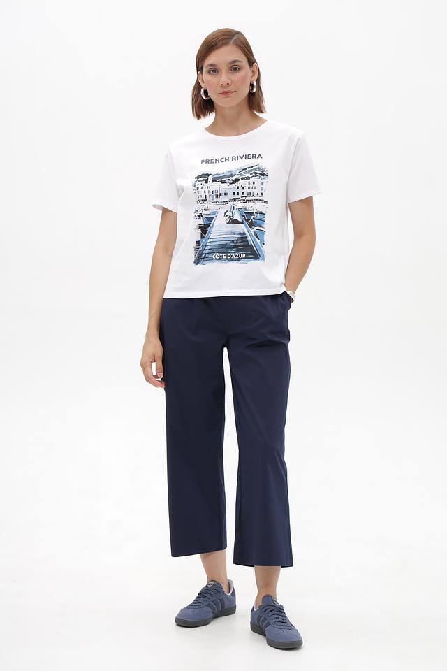Футболка Monari – стильная и удобная модель, выполненная в белом цвете. Футболка украшена ярким принтом с изображением пейзажа Французской Ривьеры, выполненным в синих и голубых оттенках. Принт расположен в центральной части изделия, создавая акцентный образ.