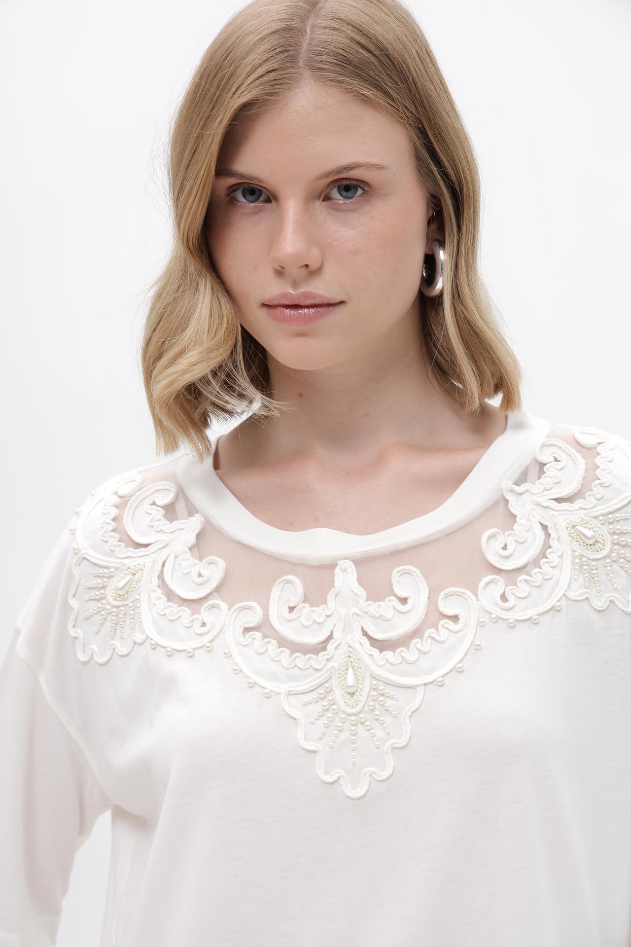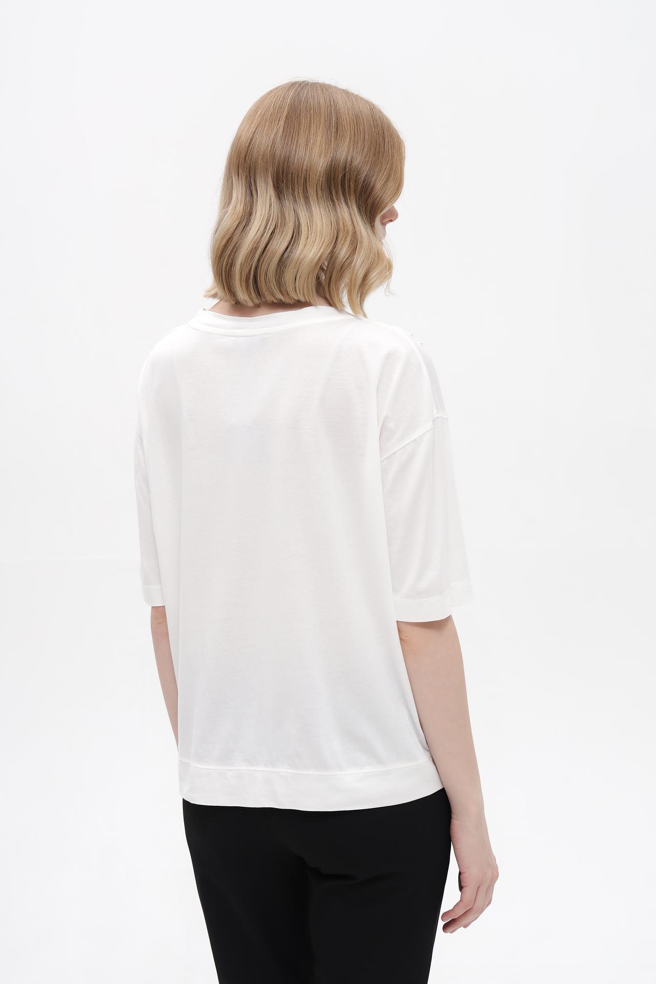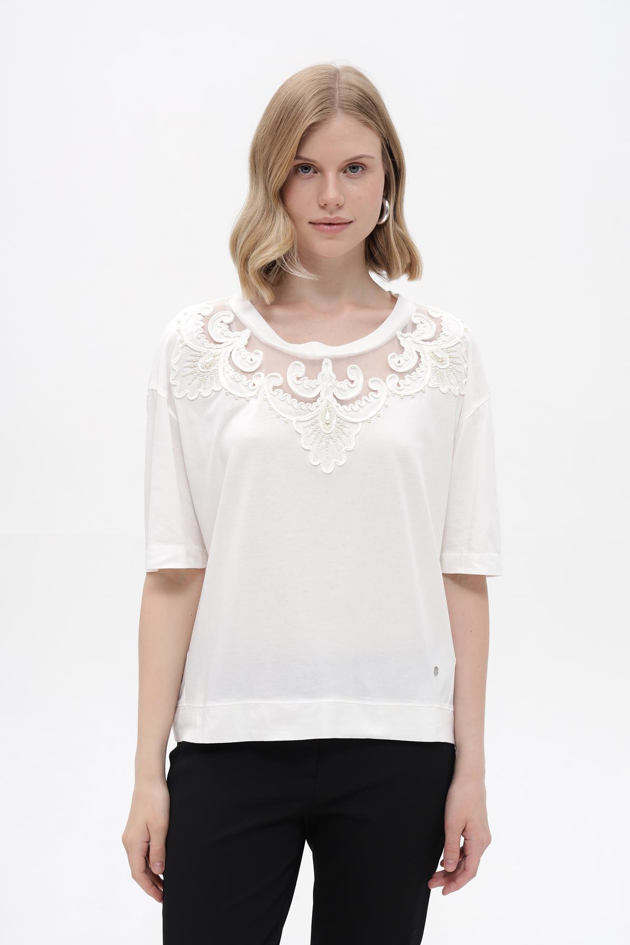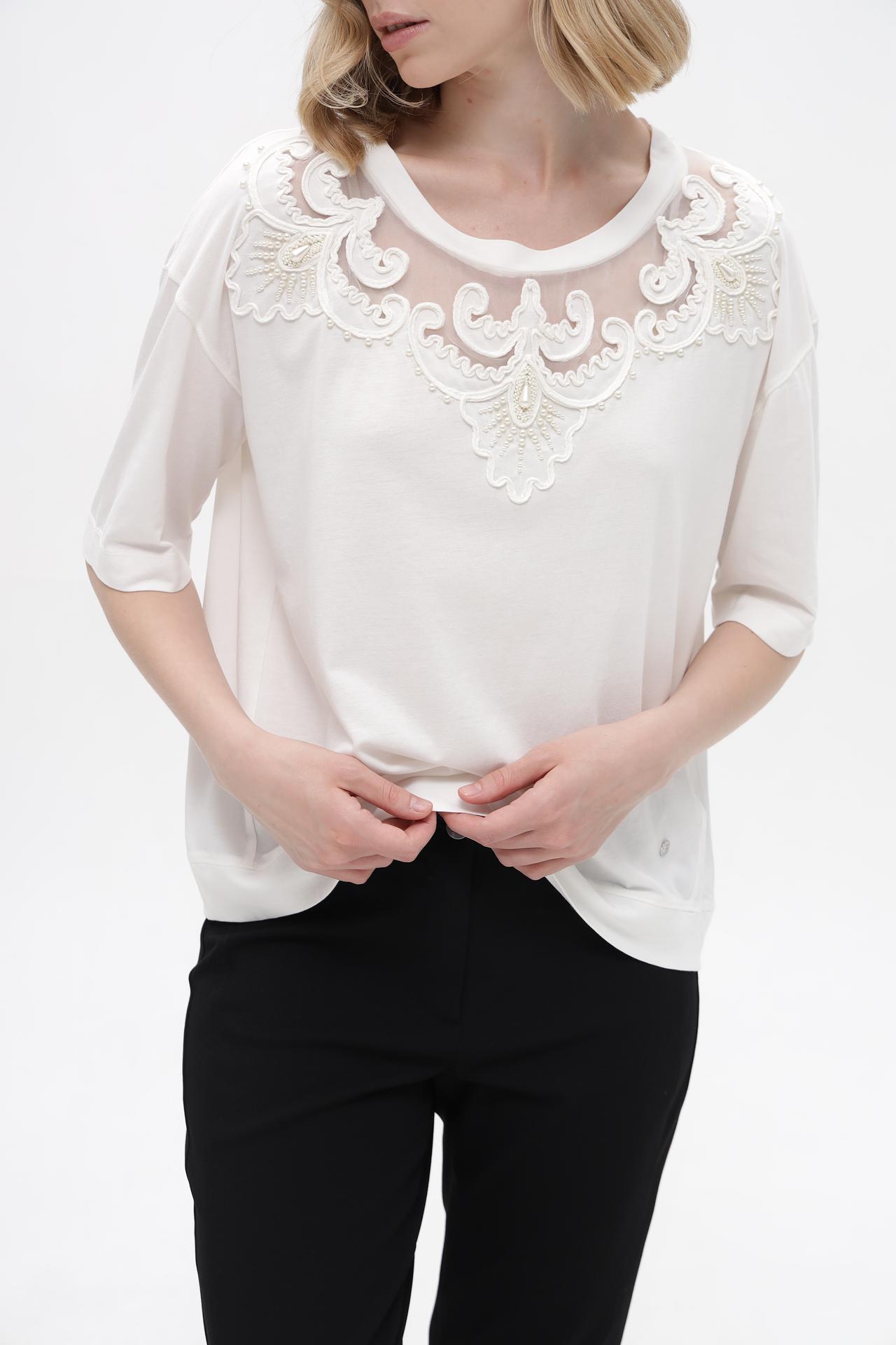 - Изысканный дизайн: Кружевной декор добавляет изысканности и делает футболку неповторимой.