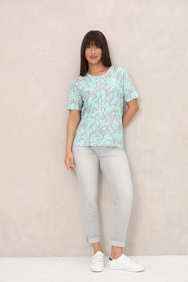 Особенностью данной модели является оригинальный принт в светло-серых и бежевых тонах на мятном фоне. Футболка имеет прямой крой и короткие рукава, что делает ее универсальной для различных типов фигур.