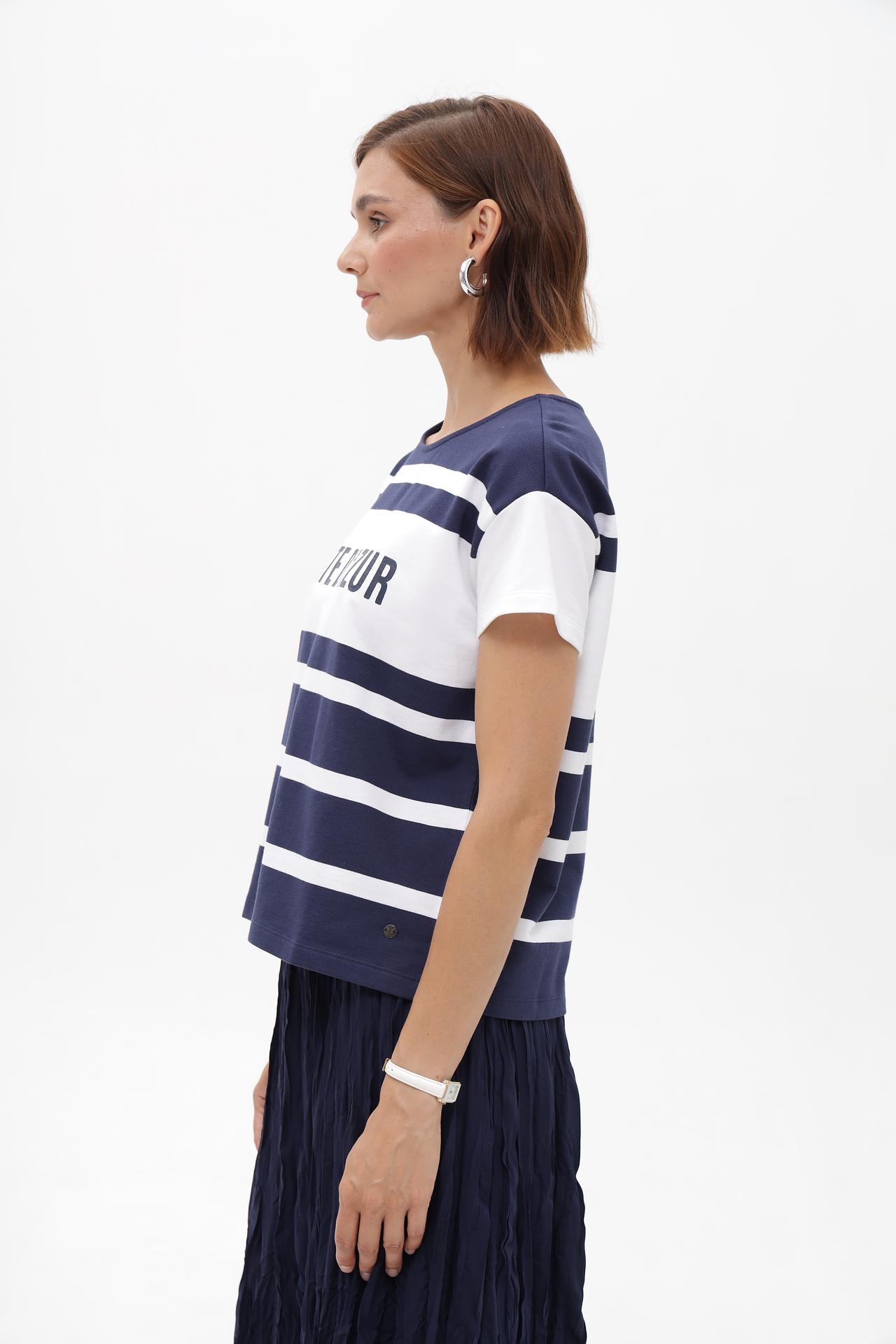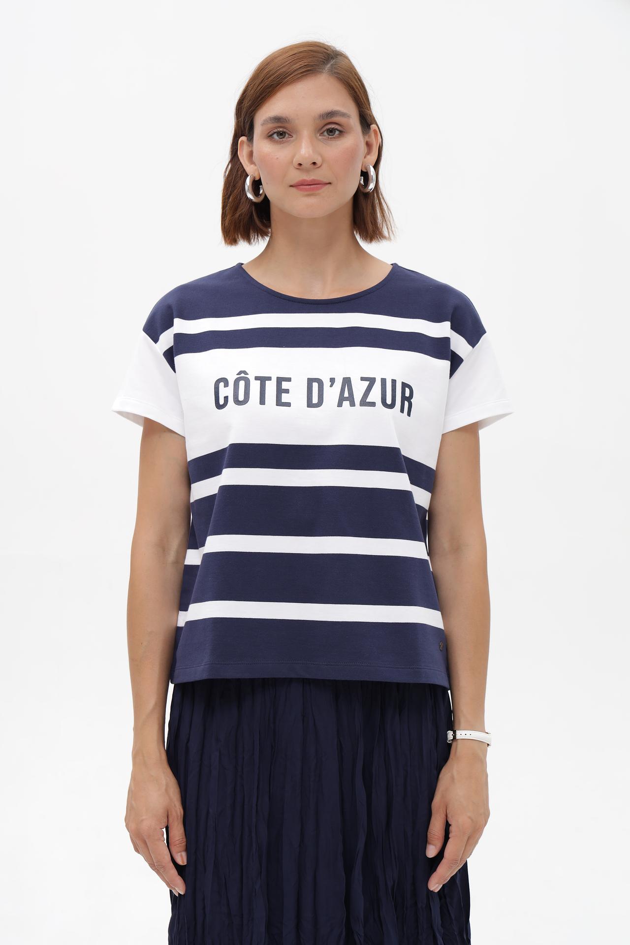 Стильная футболка Monari из 100% хлопка - идеальный выбор для вашего летнего гардероба. Эта футболка сочетает в себе комфорт и элегантность, создавая неповторимый образ для любого случая. Модель выполнена в классическом дизайне с полосатым принтом и надписью.