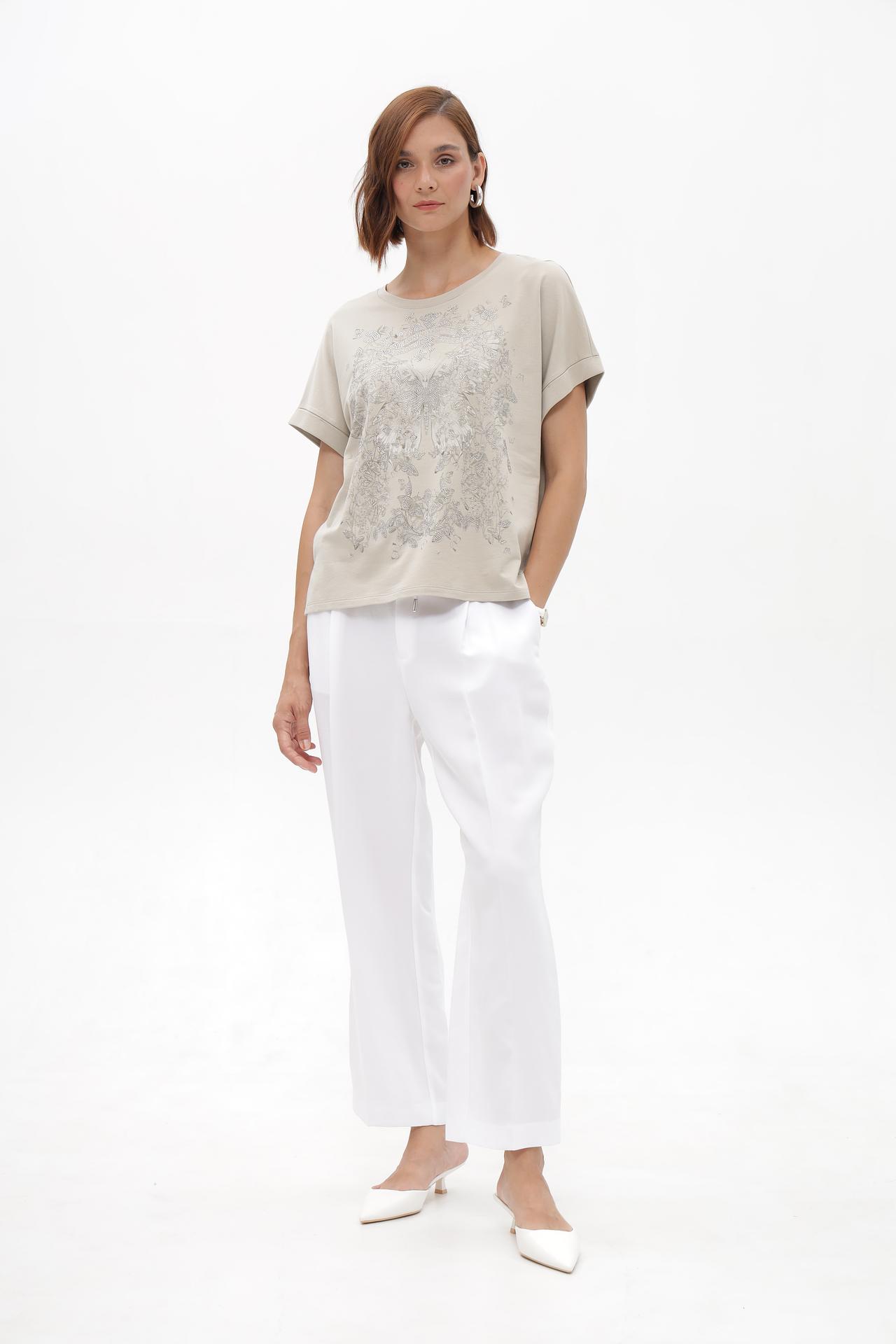 - Универсальный стиль: Лаконичный дизайн позволяет легко комбинировать футболку с джинсами, юбками, брюками и жакетами, создавая разнообразные образы для любого случая.