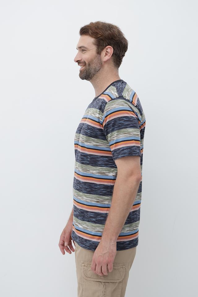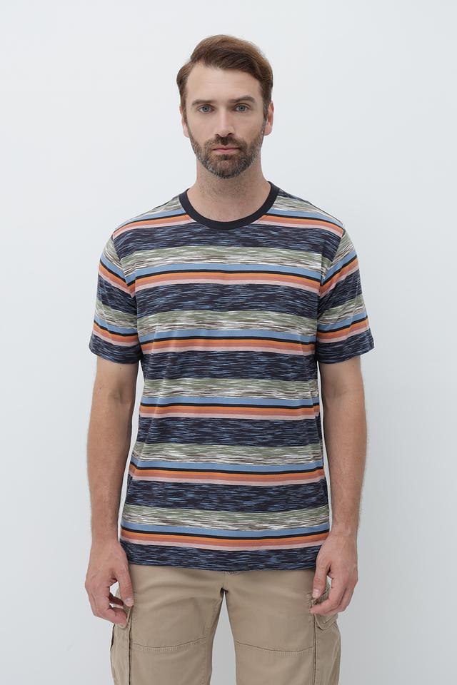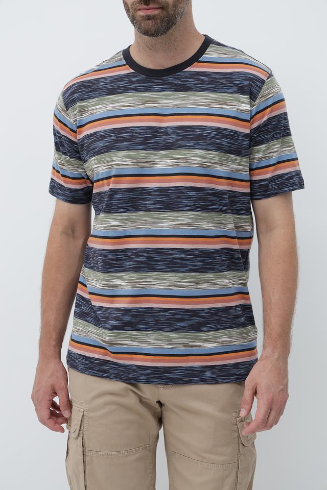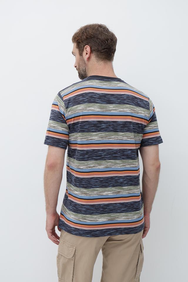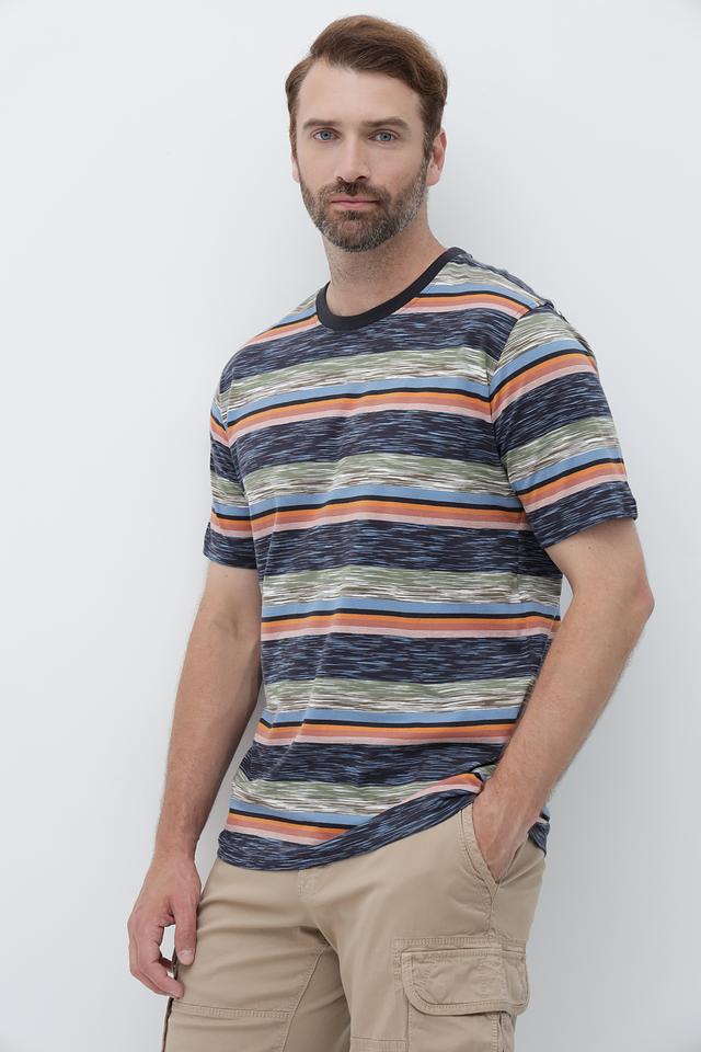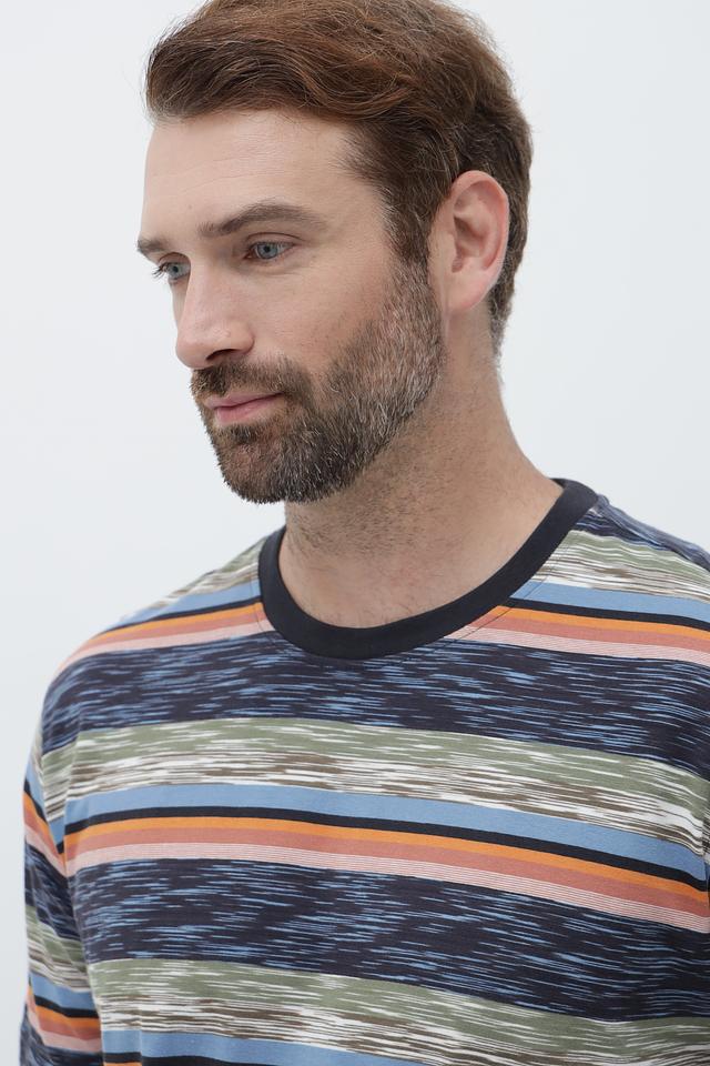 Футболка имеет классический крой и круглый вырез горловины. Главная особенность – яркий полосатый принт в синих, оранжевых и зеленых тонах, который добавит вашему образу индивидуальности.