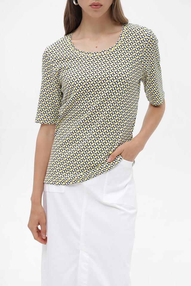 Футболка имеет прямой крой, короткий рукав и округлый вырез горловины. Главной особенностью модели является яркий геометрический принт, выполненный в сочетании зеленого, желтого и темно-синего цветов. Такой рисунок добавит вашему образу оригинальности и индивидуальности.