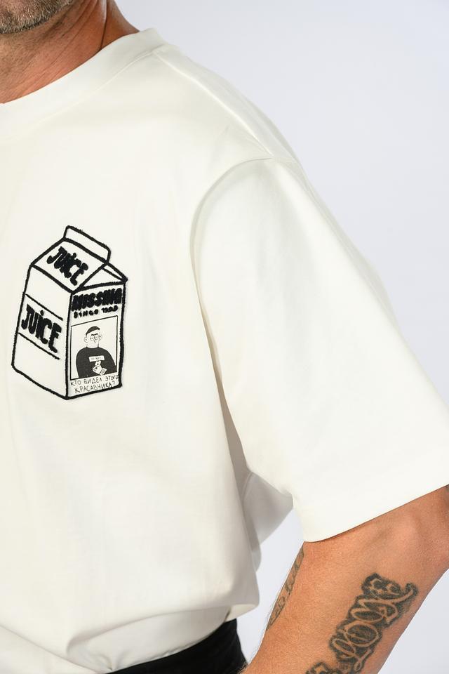 Мужская футболка Onot1 молочного цвета с оригинальным принтом в виде упаковки сока. Изготовлена из 100% хлопка, обеспечивающего комфорт в носке. Отличный выбор для создания повседневного образа. Состав: хлопок 100%