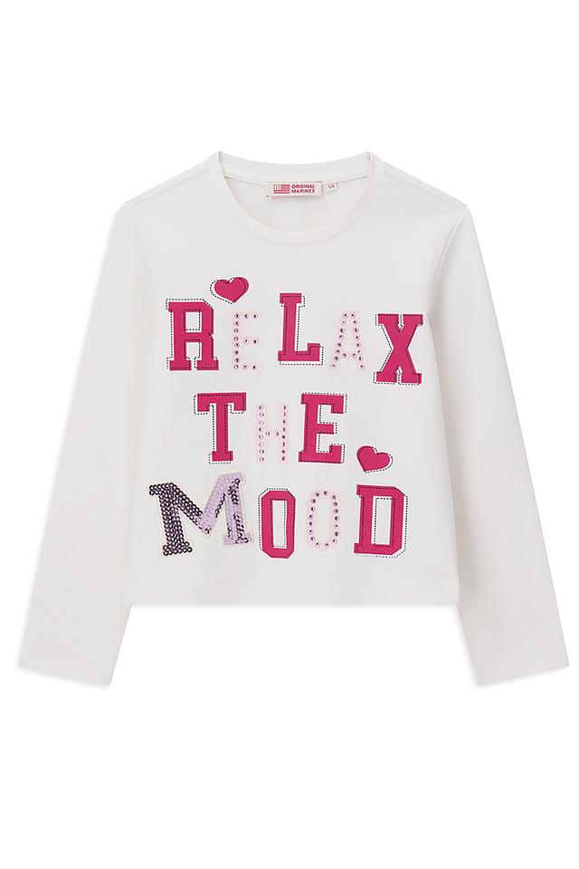 Белая футболка Original Marines для девочки с ярким принтом "RELAX THE MOOD". Изготовлена из мягкого хлопка с добавлением эластана для комфорта и свободы движений. Состав: хлопок 92%, эластан 8%