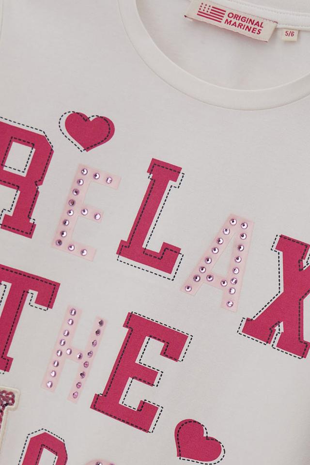 Эта стильная футболка от Original Marines станет отличным дополнением к гардеробу юной модницы. Футболка выполнена в белом цвете и украшена эффектным принтом с надписью "RELAX THE MOOD", выполненным в розовых тонах и декорированным стразами.