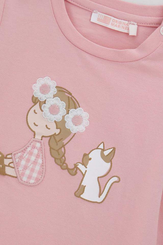 Розовая футболка Original Marines для девочки с длинным рукавом украшена очаровательным принтом с изображением девочки и котика. Изготовлена из мягкого хлопка с добавлением эластана для комфорта и свободы движений. Состав: хлопок 92%, эластан 8%