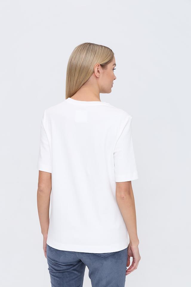 Эта стильная футболка от бренда Oui станет отличным дополнением к вашему гардеробу. Футболка выполнена в белом цвете и украшена эффектным принтом "Shine", который привлекает внимание и придает образу индивидуальность.