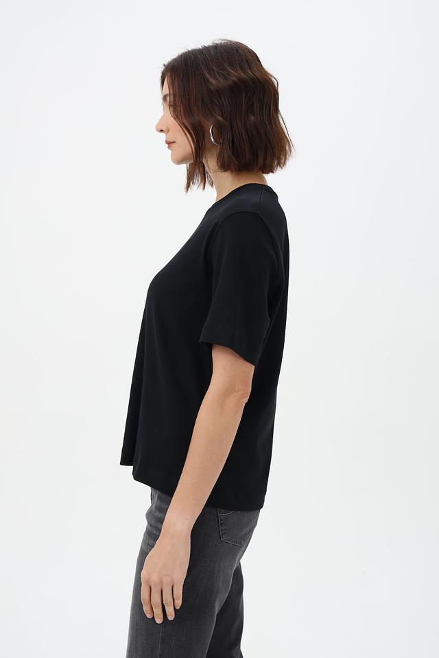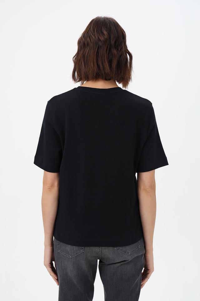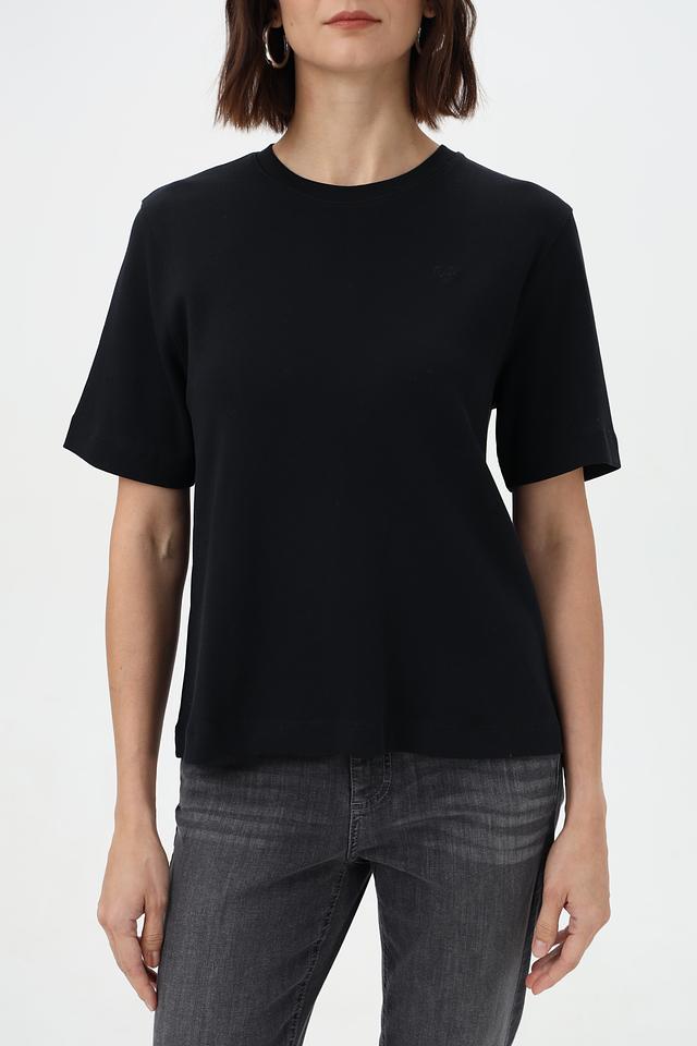 Футболка имеет классический прямой крой, который подходит для любого типа фигуры. Короткие рукава и круглый вырез горловины делают эту модель универсальной и подходящей для различных стилей. На груди располагается небольшой логотип бренда, выполненный в тон изделия.