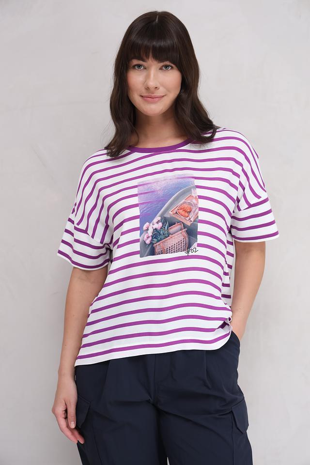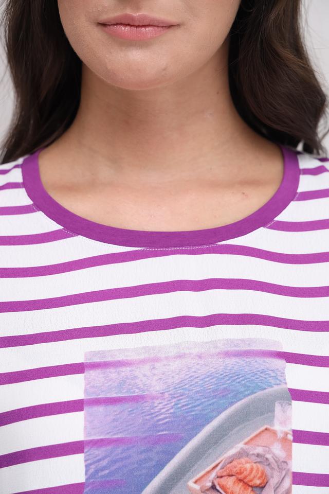 Эта стильная футболка от бренда Oui станет отличным дополнением к вашему гардеробу. Футболка выполнена в полоску, сочетающую белый и лиловый цвета, что придает ей свежий и современный вид.