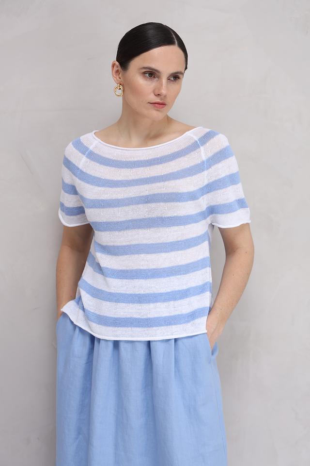 Женская футболка Oui голубого цвета с классическим полосатым принтом. Изготовлена из 100% льна, что обеспечивает комфорт и воздухопроницаемость в жаркую погоду. Стильный и универсальный вариант для создания повседневных образов. Состав: лен 100%