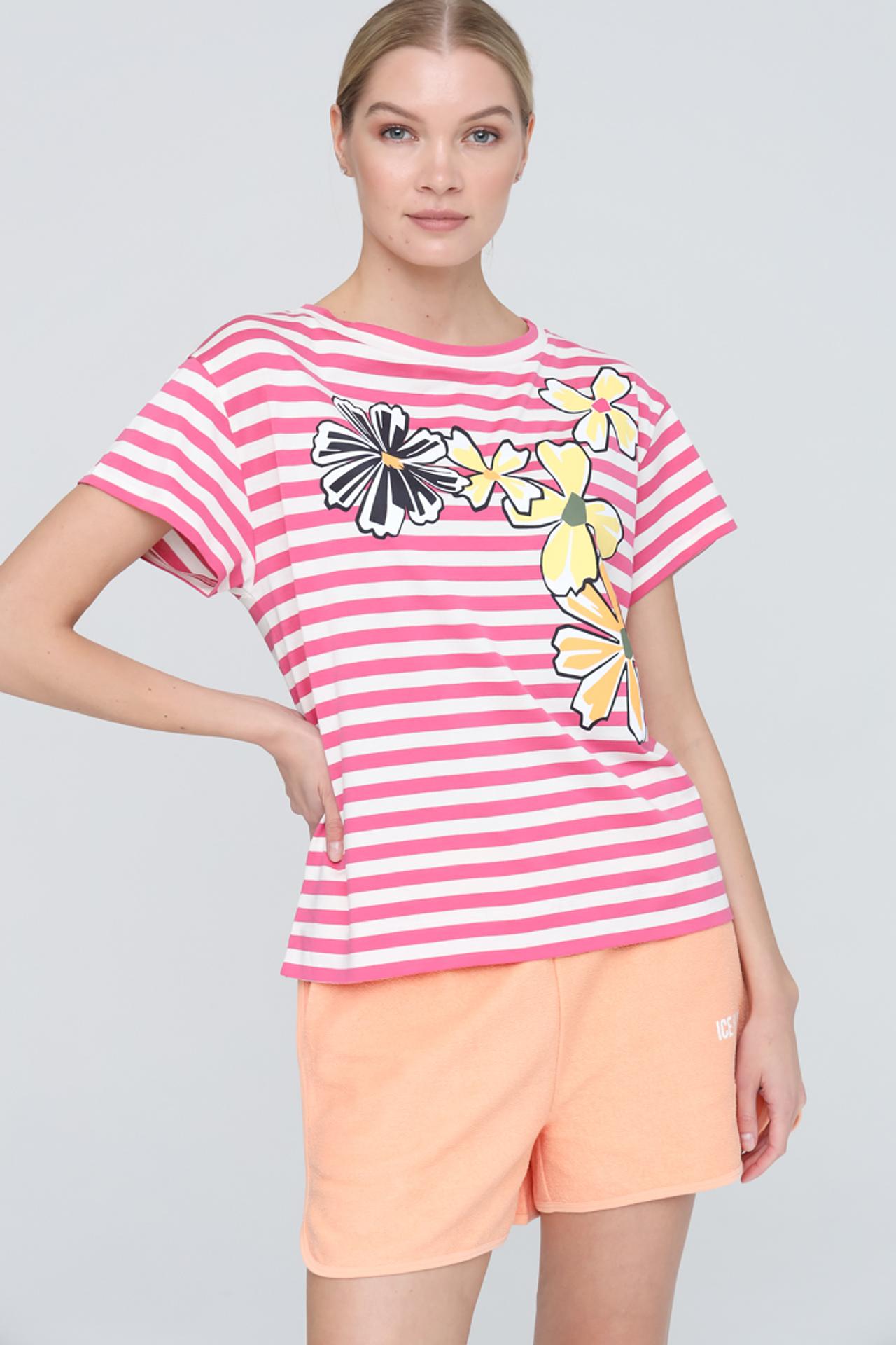 Стильная женская футболка Penny Black станет ярким акцентом вашего летнего гардероба. Эта модная футболка с коротким рукавом и классическим круглым вырезом выполнена в привлекательном дизайне: розовые и белые горизонтальные полоски дополнены красочным цветочным принтом. Идеально подходит для создания свежих повседневных образов.