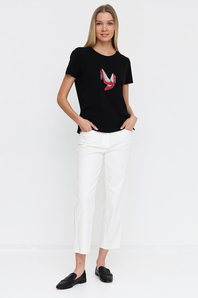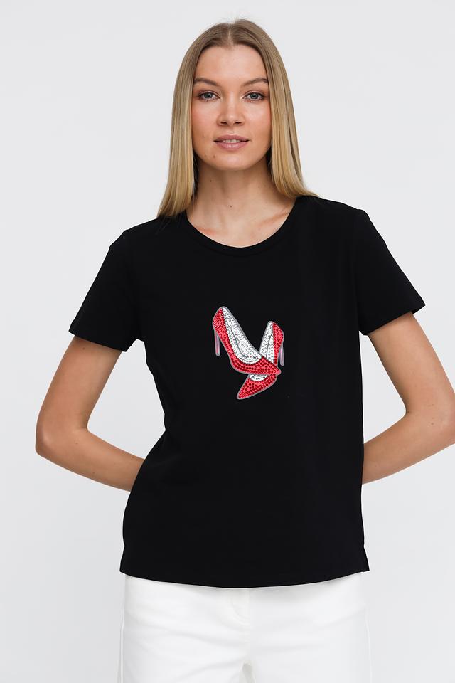 Основной цвет футболки – чёрный, который отлично сочетается с любым низом. Главная особенность модели – эффектный принт в виде красных туфель на каблуке, выполненный с использованием ярких деталей.