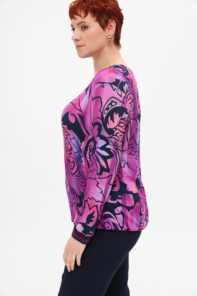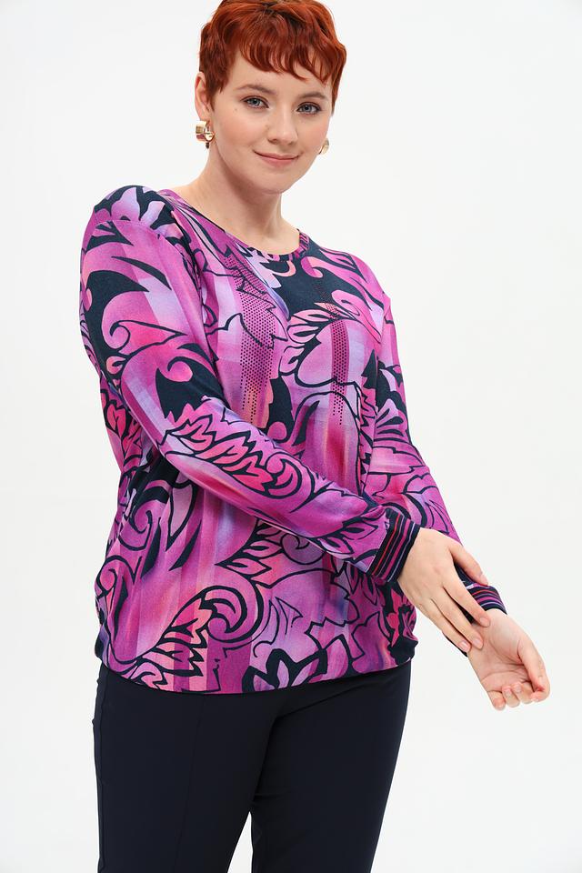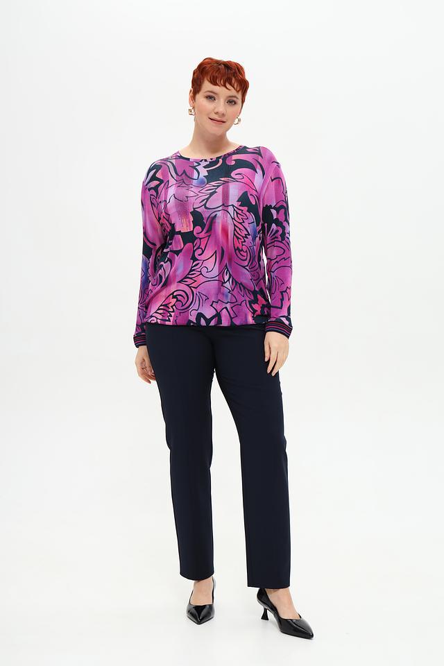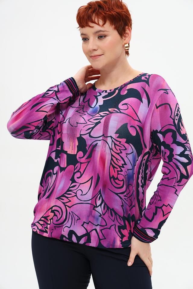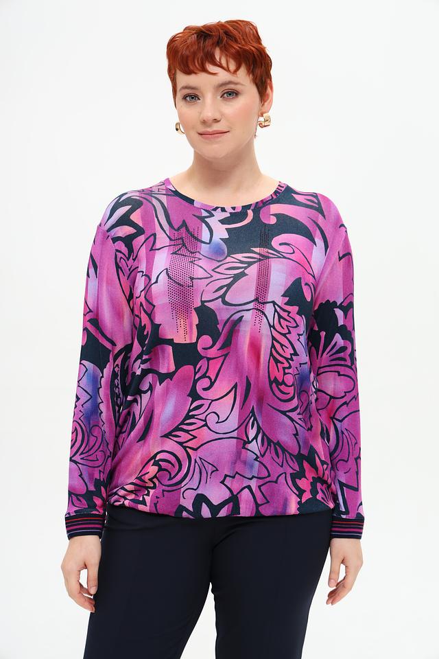 Футболка имеет свободный крой и длинные рукава, что делает ее универсальной для различных сезонов. Главная особенность модели – эффектный цветочный принт в фуксиевых тонах, который придает ей неповторимый стиль.