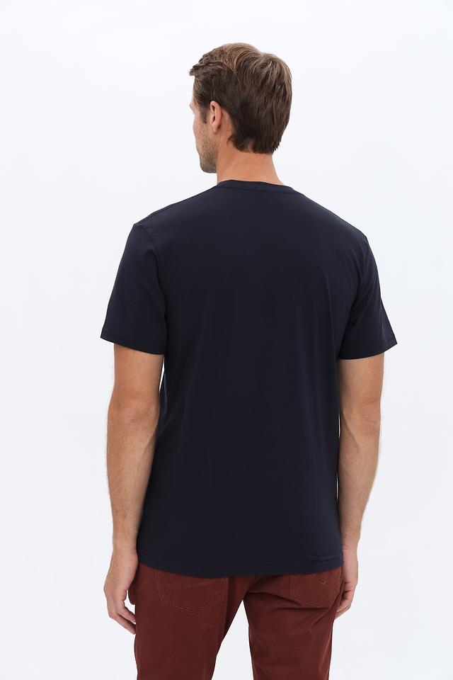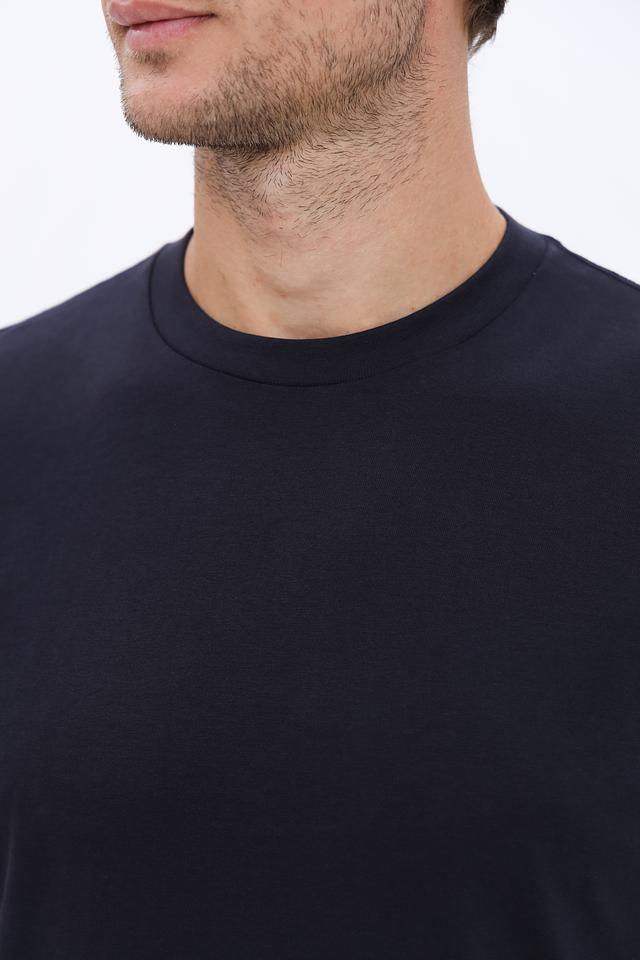 Футболка имеет классический прямой крой, который подходит для любого типа фигуры. Круглый вырез горловины и короткие рукава делают ее идеальным выбором для теплой погоды. Тёмно-синий цвет футболки универсален и легко сочетается с различными элементами одежды.