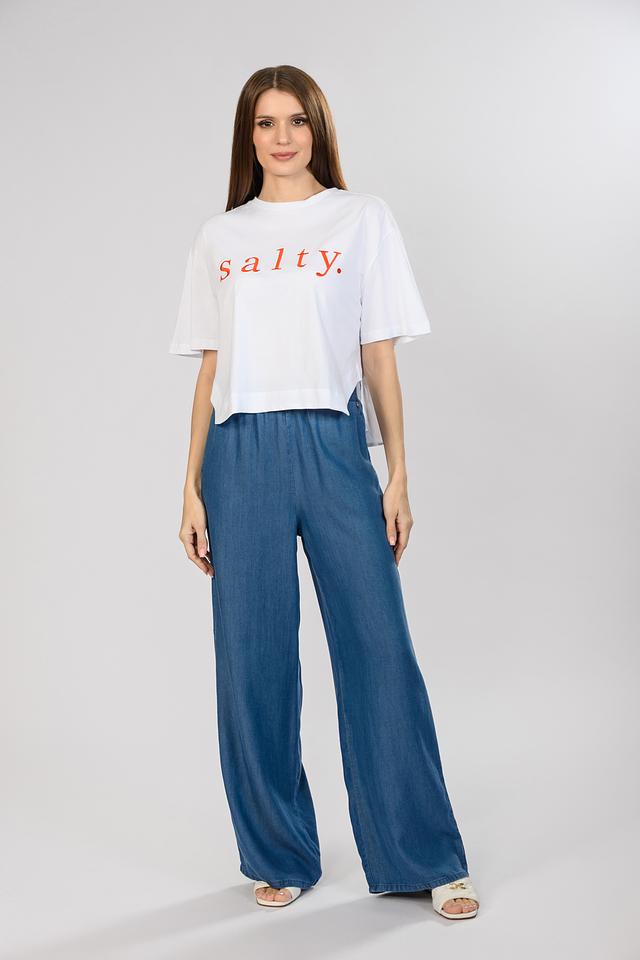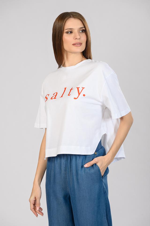 Особенностью данной модели является яркая надпись "salty.", выполненная красным цветом, которая придает образу оригинальность и индивидуальность. Небольшая вытачка на плече сзади добавляет интересный акцент. Эта футболка станет отличным выбором для повседневной носки и создания стильных образов.