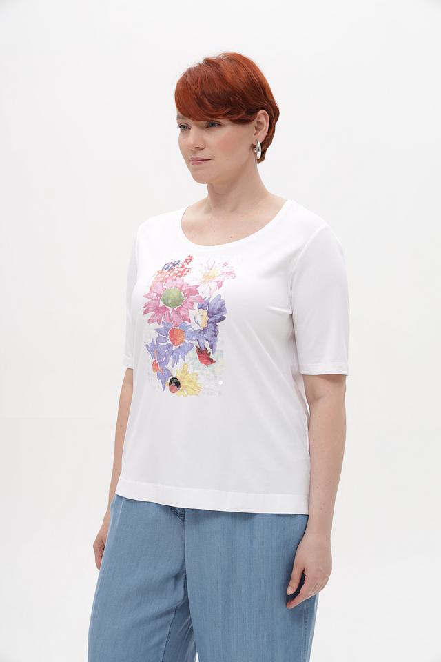 Белая футболка Samoon с ярким цветочным принтом и божьей коровкой станет отличным дополнением к вашему летнему гардеробу. Изготовлена из мягкого и приятного к телу модала с добавлением хлопка и эластана. Состав: модал 50%, хлопок 45%, эластан 5%