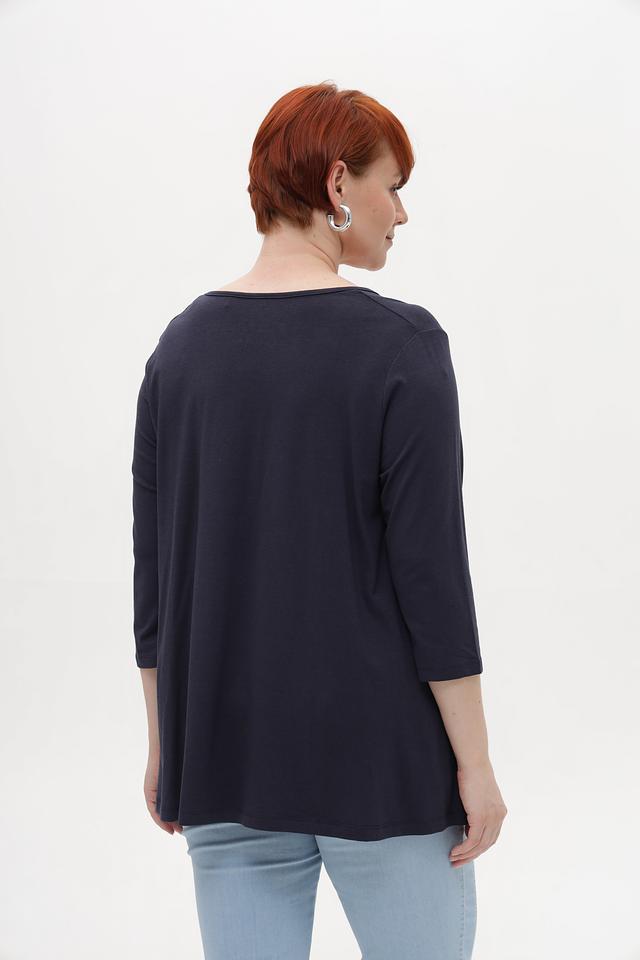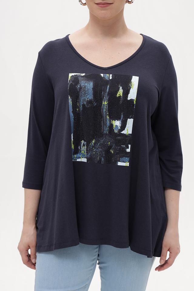 Тёмно-синяя футболка от Samoon с оригинальным принтом. Изготовлена из мягкого модала с добавлением хлопка и эластана для комфорта в носке. Подчеркнёт ваш стиль и индивидуальность. Состав: модал 50%, хлопок 45%, эластан 5%