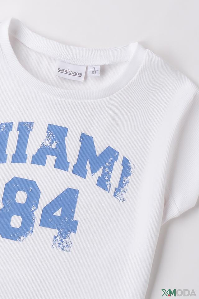 Белая футболка Sarabanda для девочки с ярким принтом "Miami". Изготовлена из мягкого хлопка с добавлением эластана для комфорта и свободы движений. Отличный выбор для повседневной носки. Состав: хлопок 95%, эластан 5%