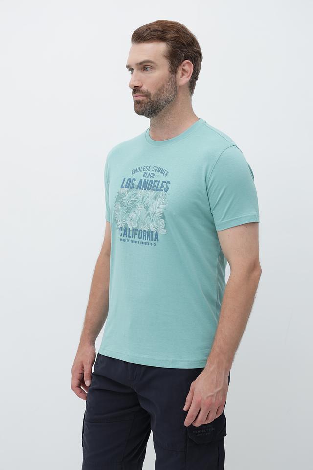 Мужская футболка Sea Barrier выполнена в спокойном мятном цвете и украшена эффектным принтом с надписью "Los Angeles" и изображением пальмовых листьев.