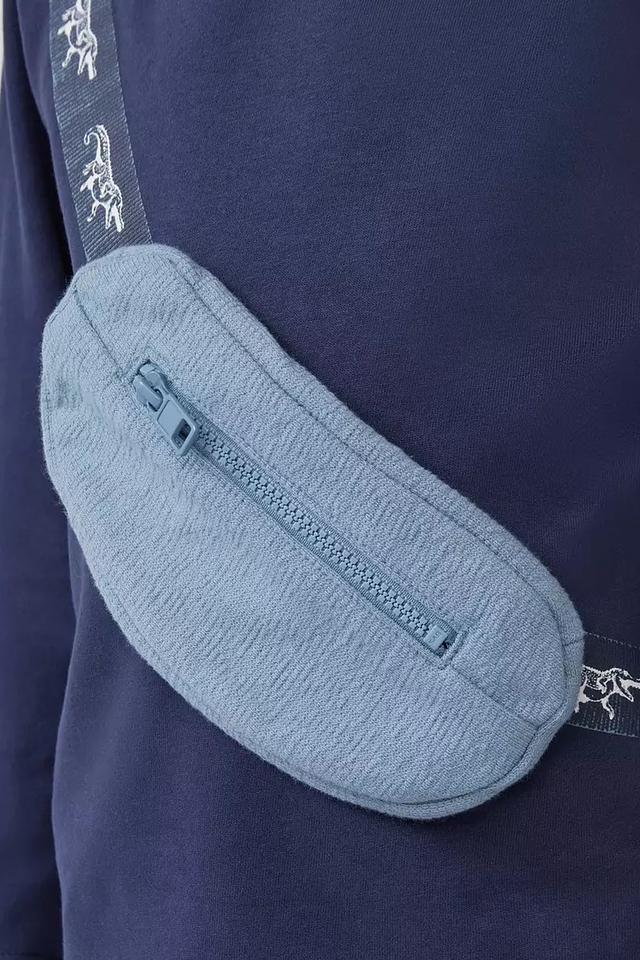 Особенностью данной модели является прикрепленная к футболке сумка-бананка голубого цвета. Сумка имеет молнию и удобный ремешок, что позволяет носить ее через плечо или на поясе.