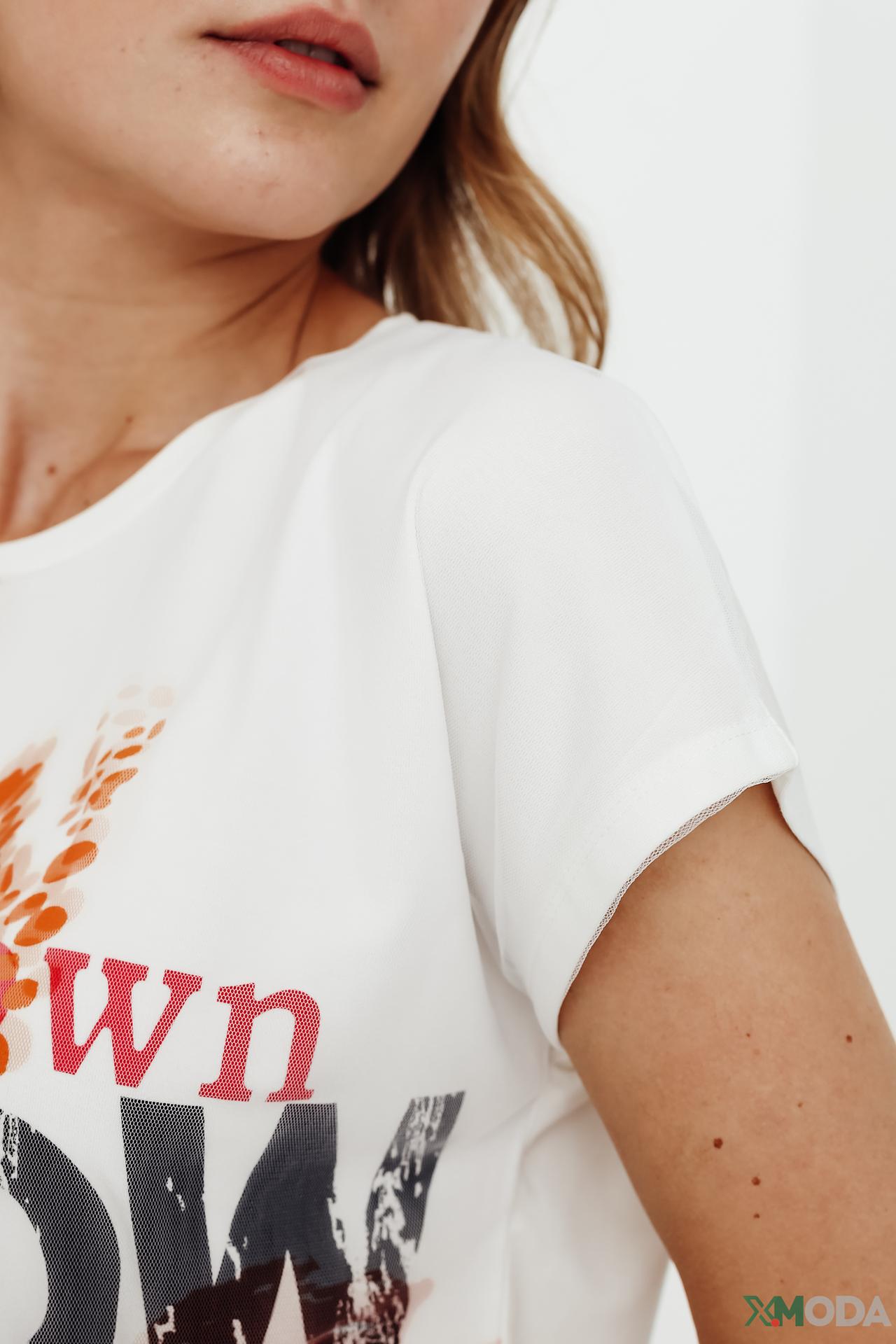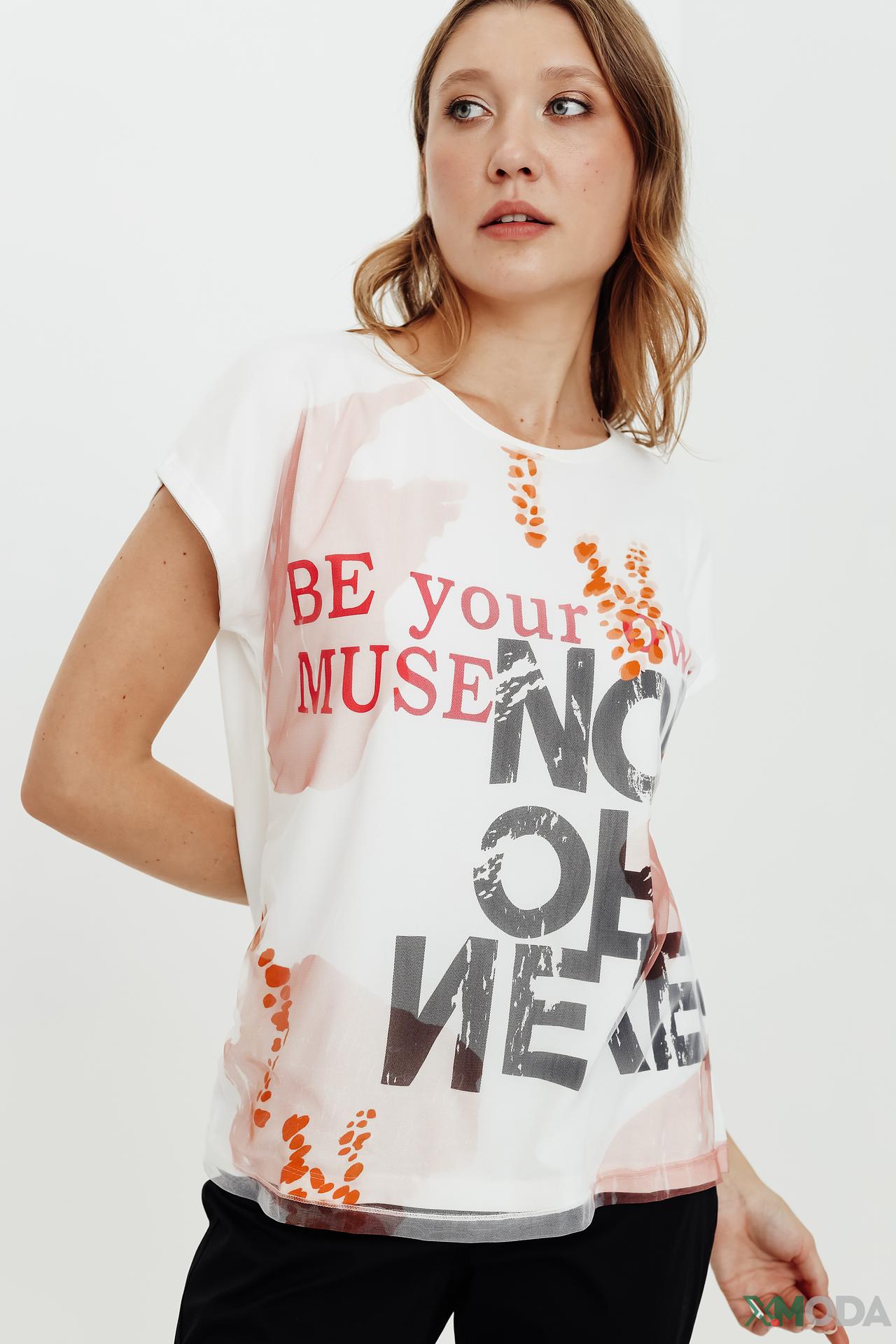 Оригинальный принт с модными надписями и абстрактными элементами делает футболку уникальной и привлекательной. Модель с короткими рукавами и классическим круглым вырезом идеально сочетается как с повседневной, так и с более нарядной одеждой.