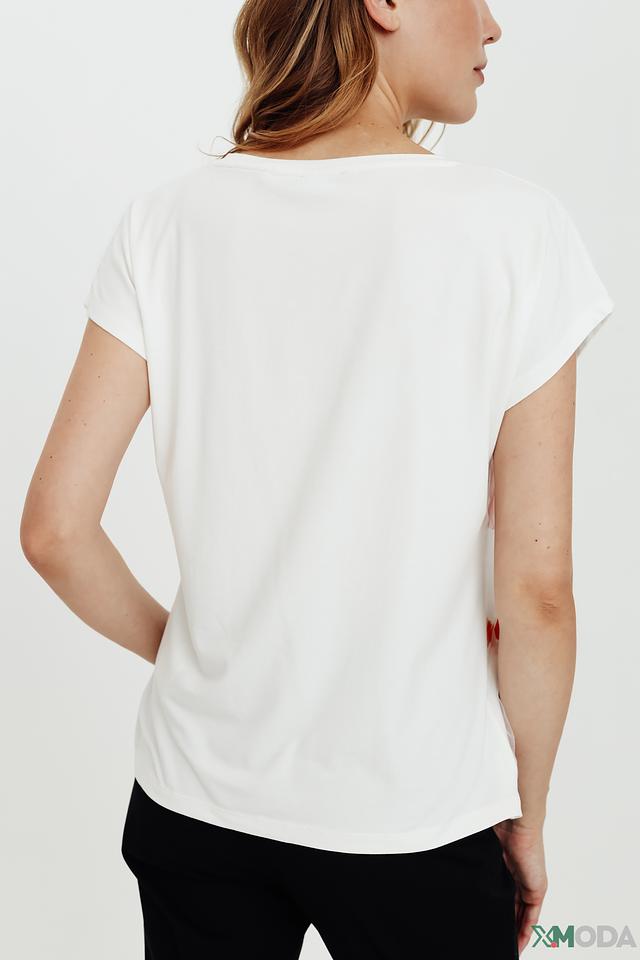 Женская футболка Taifun светло-розового цвета с ярким графичным принтом. Модель свободного кроя с короткими рукавами-крылышками, выполнена из мягкой вискозы с добавлением эластана для комфорта. Состав: вискоза 95%, эластан 5%