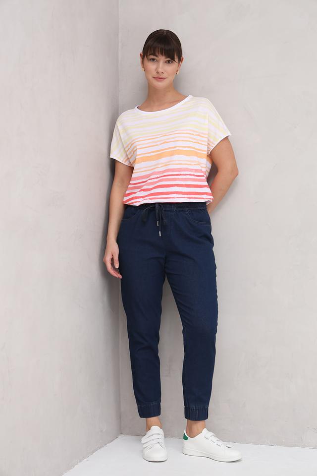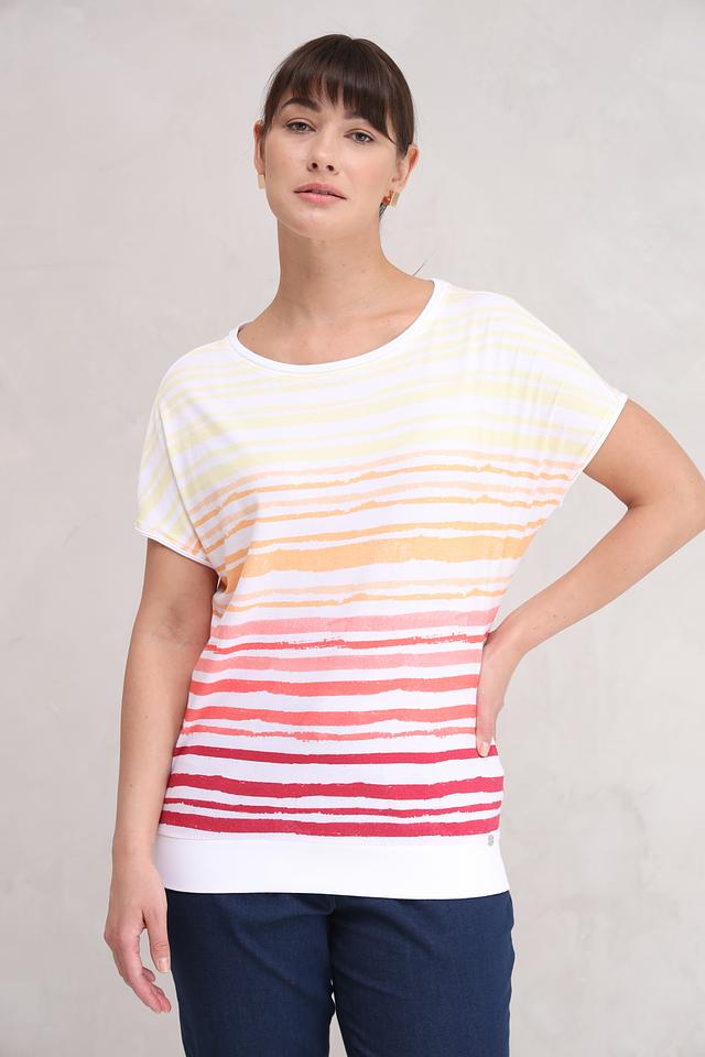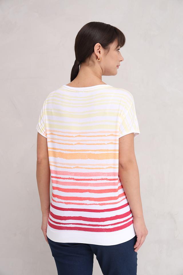 Футболка имеет свободный крой, который не сковывает движений и позволяет коже дышать. Оригинальный полосатый принт в сочетании нежных оттенков – от белого и бледно-жёлтого до персикового и розового – делает эту модель особенно привлекательной и универсальной.
